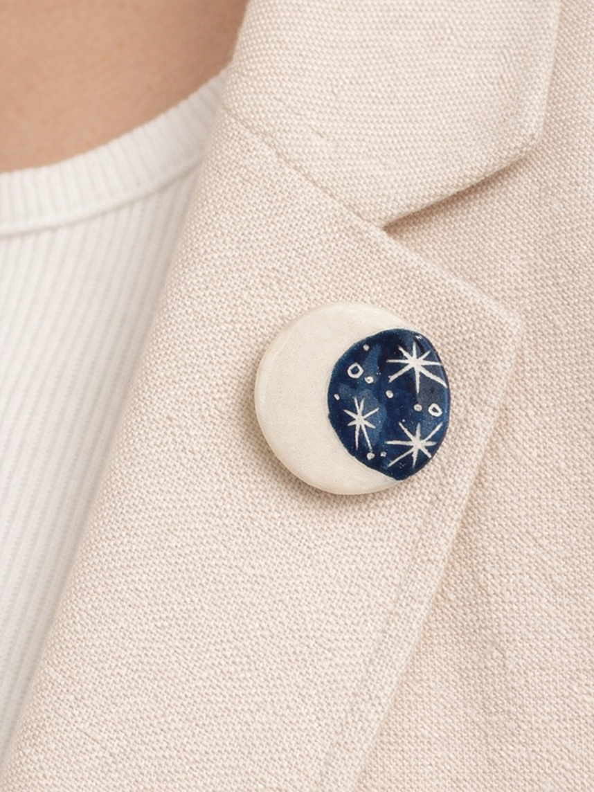 Брошь ручной работы Elizabeth Madar Месяц, круглая, синяя, керамика