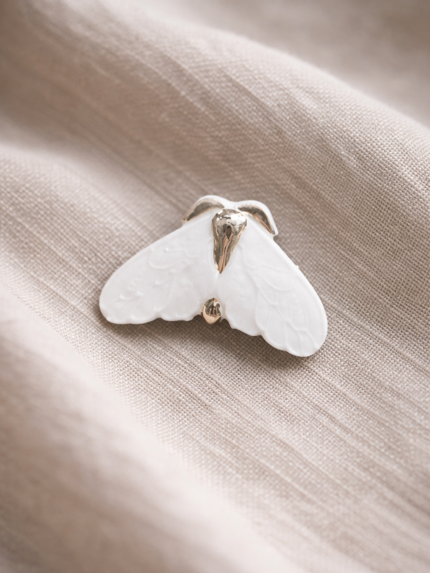 Фарфоровая брошь «Моль» бело-серебристого цвета.