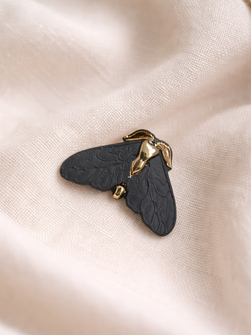 Фарфоровая брошь «Моль» в чёрно-серебряном цвете.