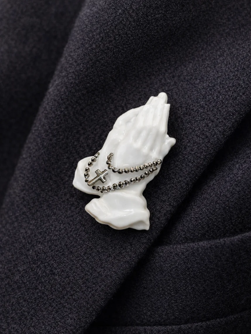 Фарфоровая брошь «Молитва» бело-серебристого цвета.