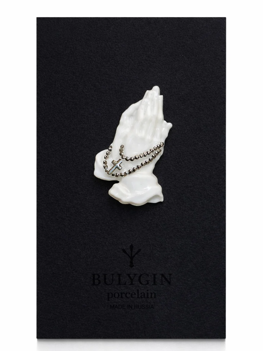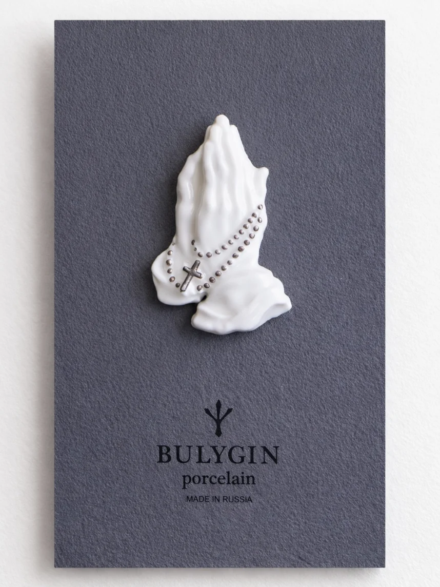 Брошь ручной работы Фарфор Булыгина «Молитва», бело-серебристая