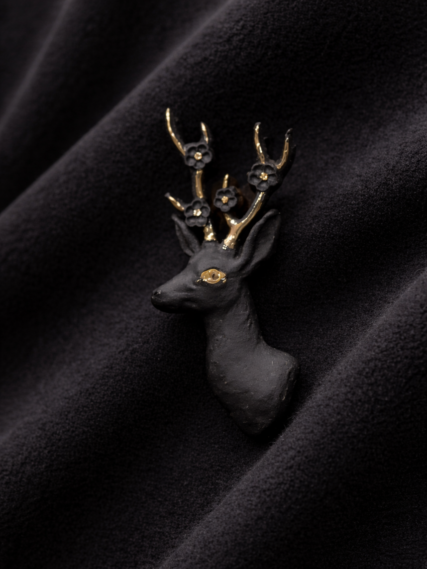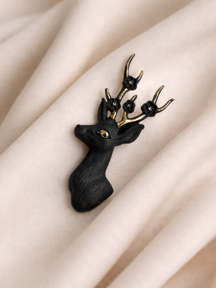 Фарфоровая брошь «Олень» в чёрно-серебряном цветем.