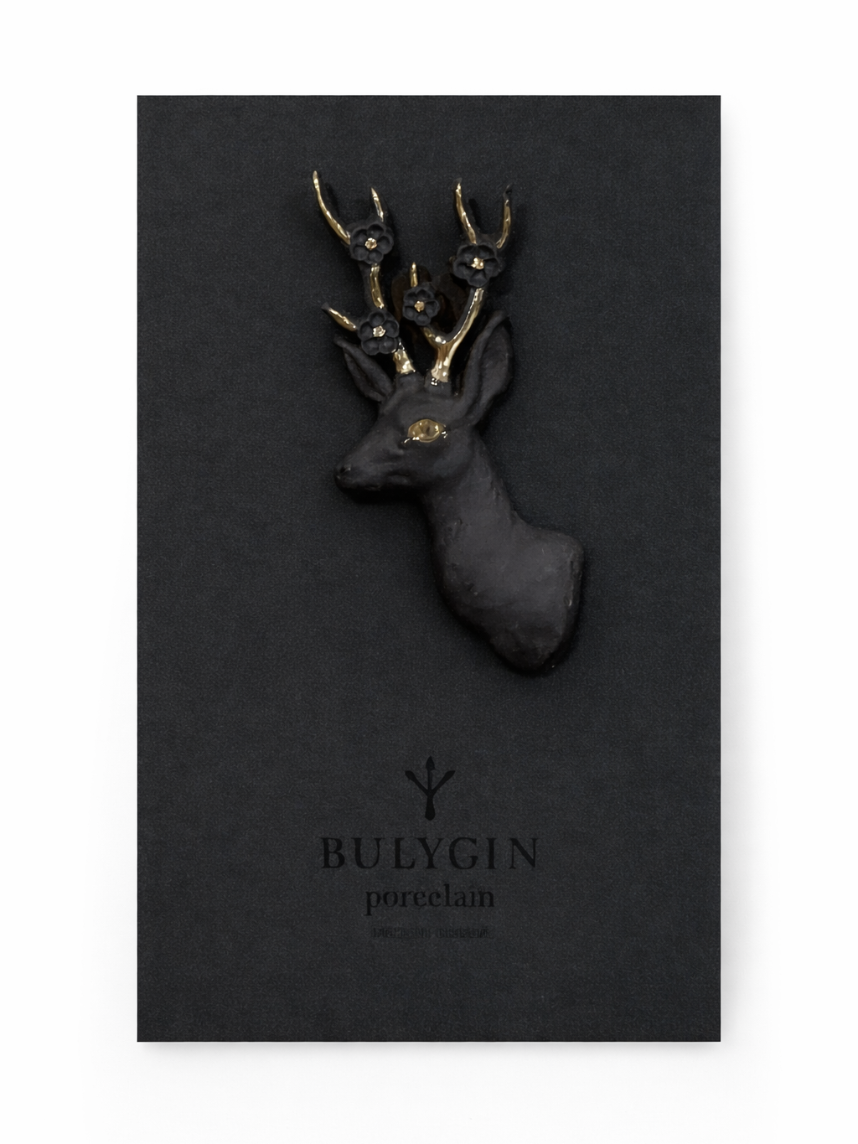 Брошь ручной работы Bulygin «Олень», фарфор, чёрно-серебристая