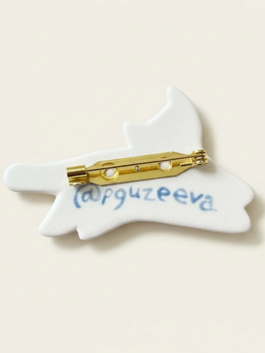Брошь ручной работы Полина Гузеева «Полосатый котик», голубая, фарфор