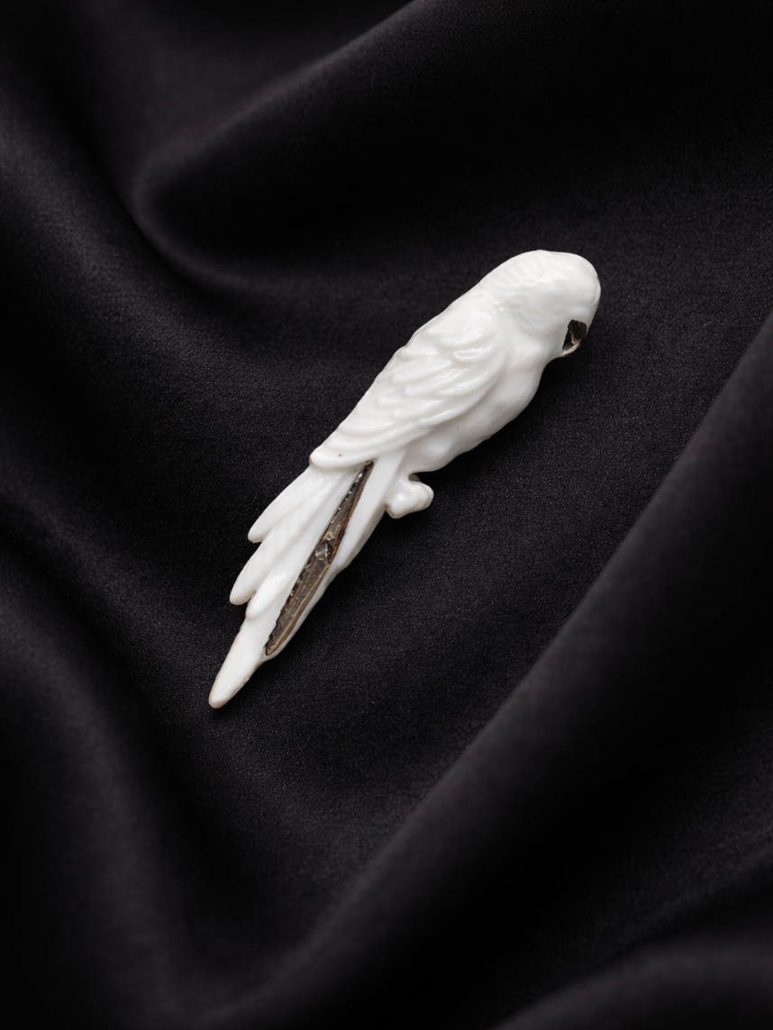 Фарфоровая брошь «Попугай» бело-серебристого цвета.
