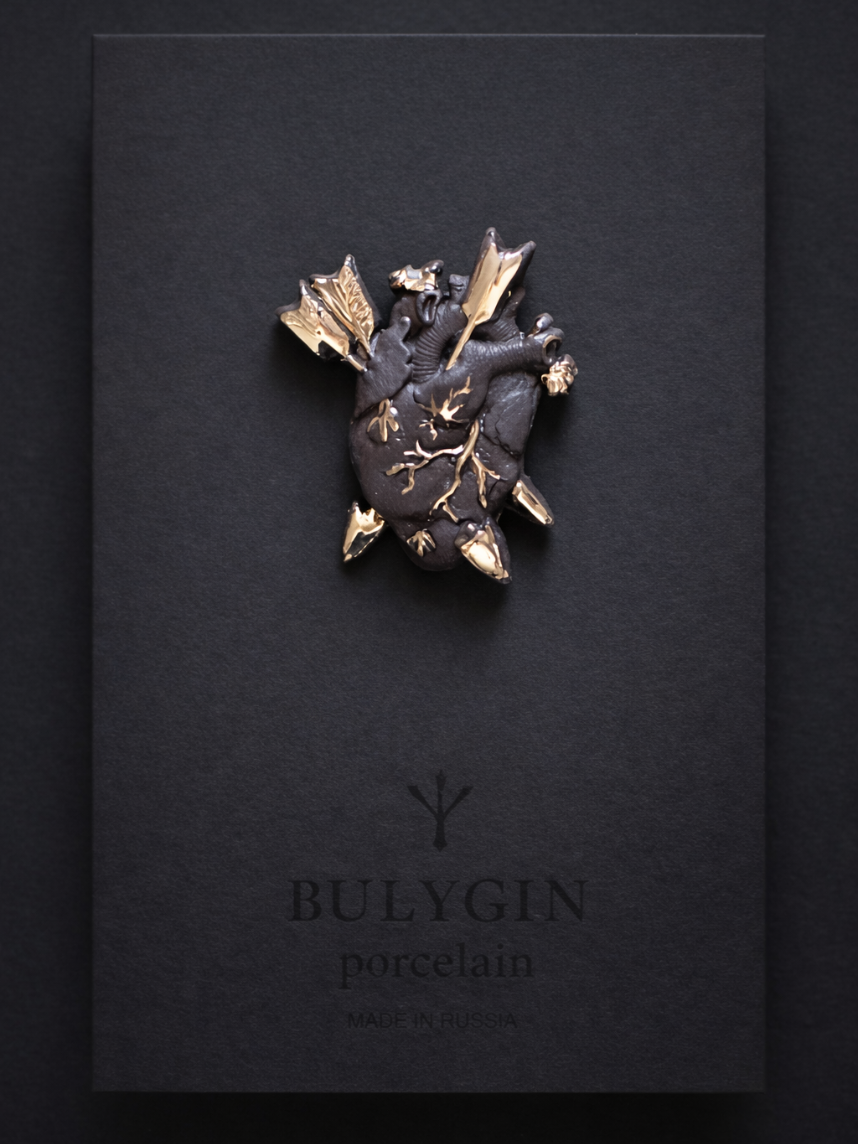 Брошь ручной работы Bulygin «Разбитое сердце», фарфор, чёрно-серебристая