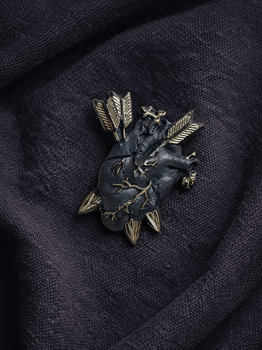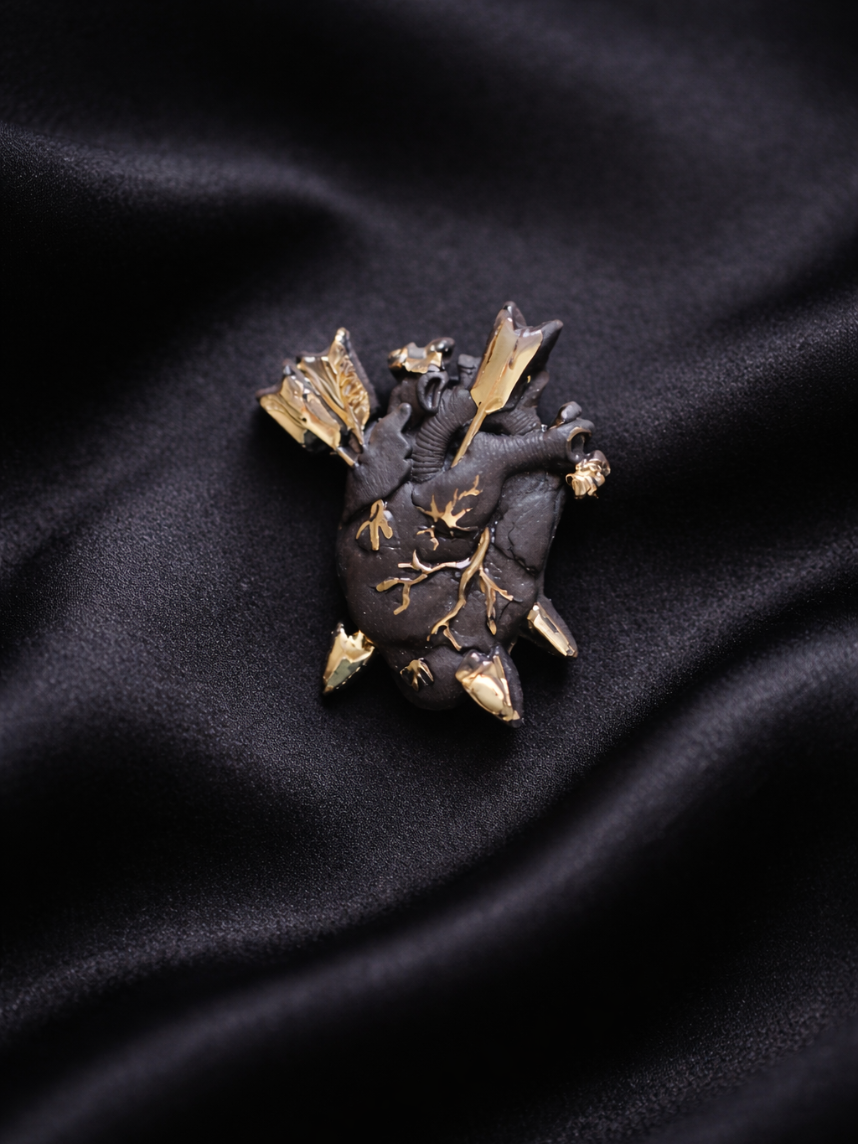 Фарфоровая брошь «Разбитое сердце» в чёрно-серебряном цвете.