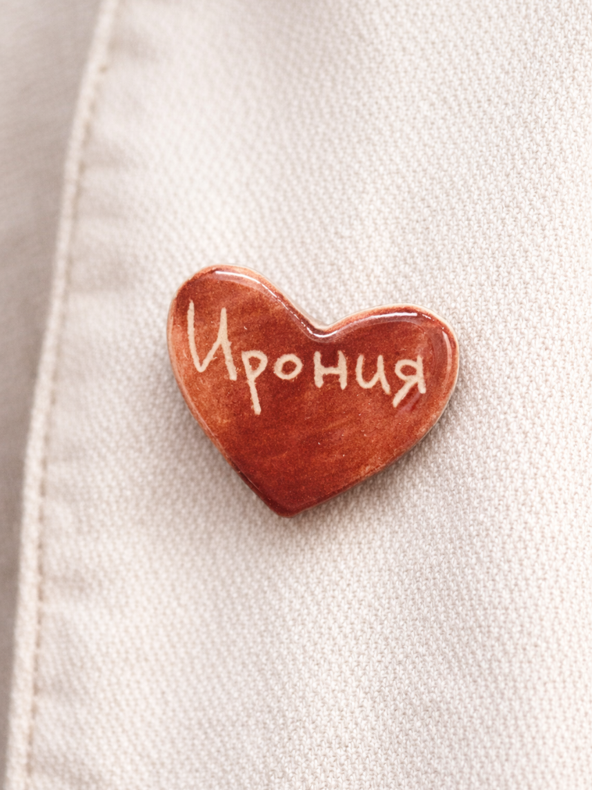 Маленькая аккуратная брошь в виде сердца с надписью «Ирония». Миниатюрный символ любви на вашем пальто, сумке или в качестве элемента декора подчеркнет вашу индивидуальность.