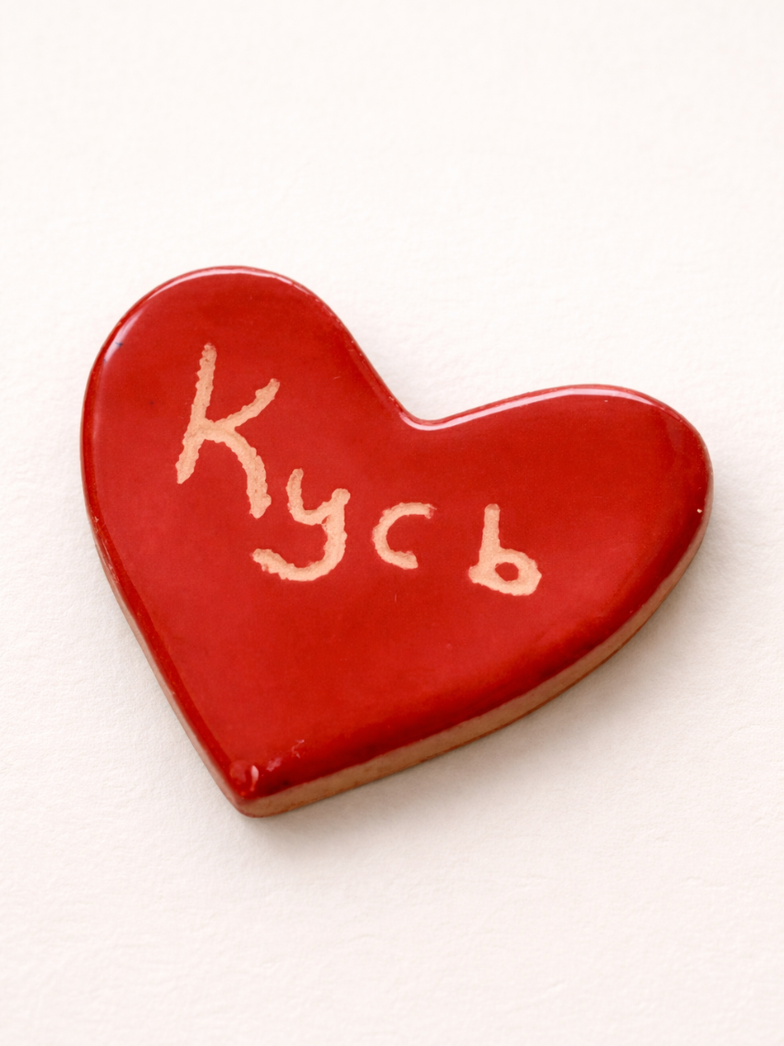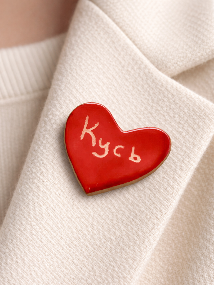 Маленькая аккуратная брошь примерно 3 см в виде сердца с надписью «Кусь». Миниатюрный символ любви на вашем пальто, сумке или в качестве элемента декора подчеркнет вашу индивидуальность.