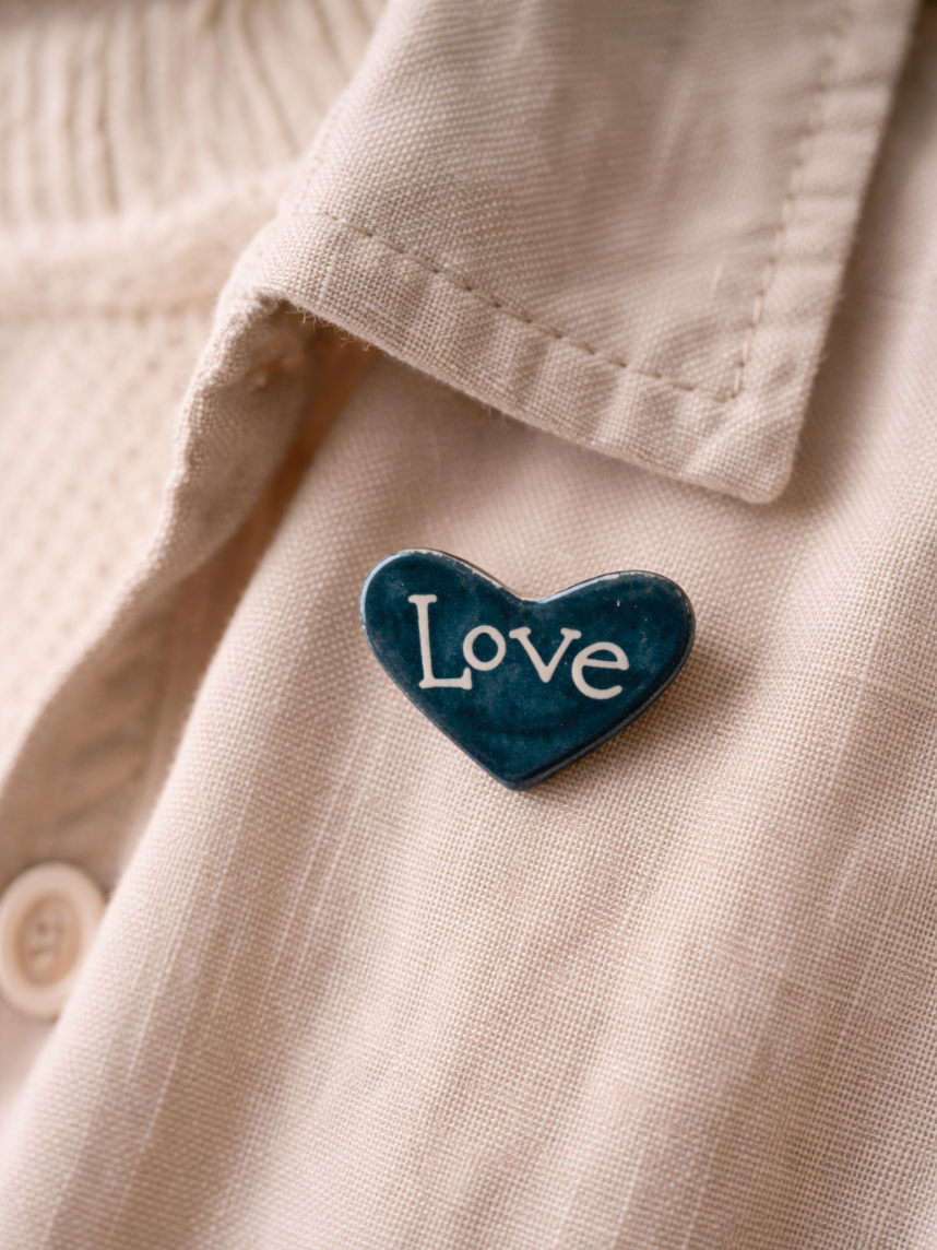 Брошь ручной работы Elizabeth Madar сердечко Love, тёмно-синяя, керамика