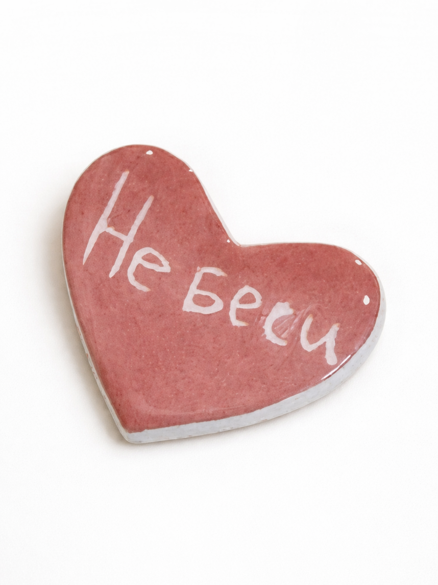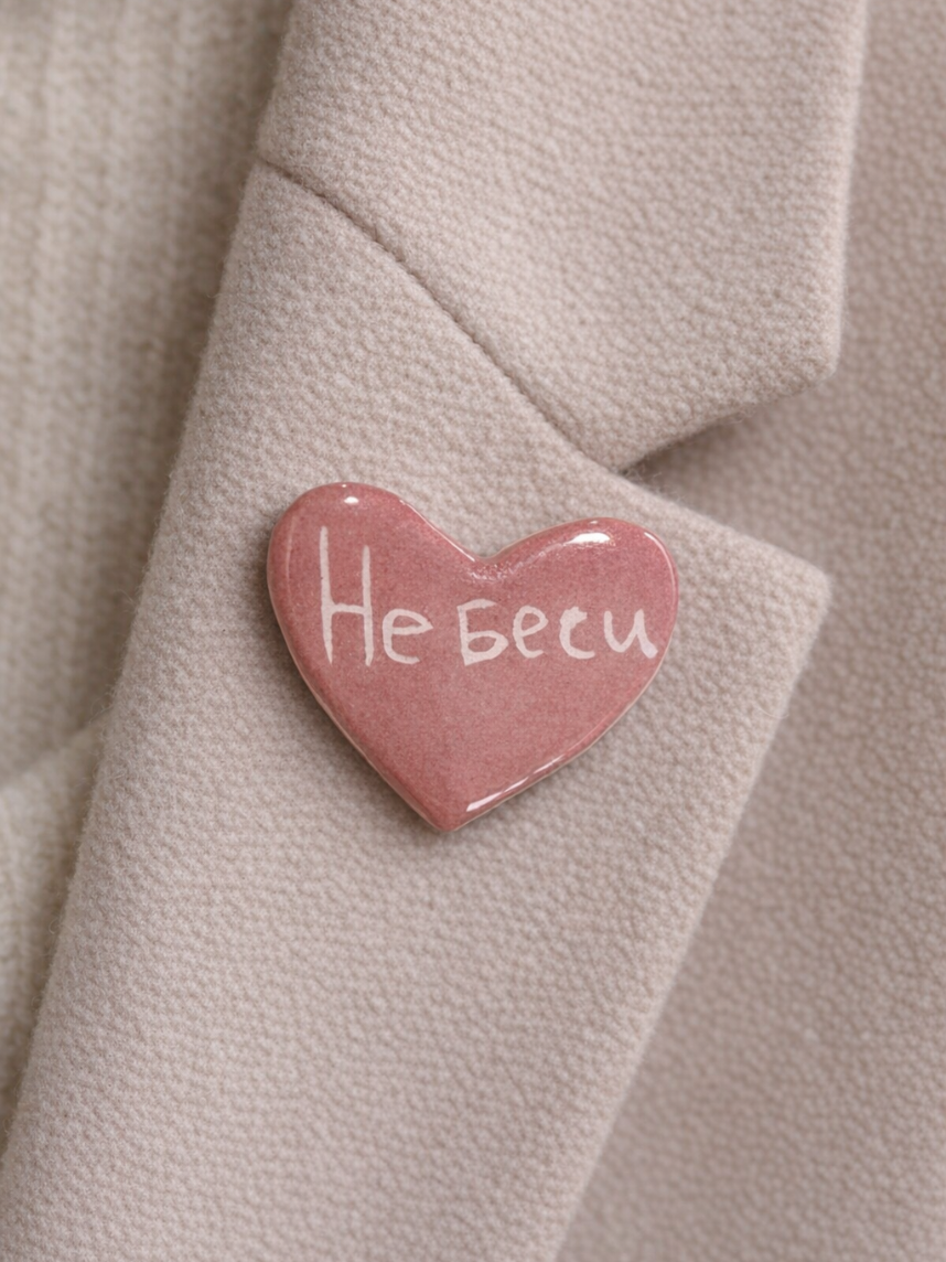Брошь ручной работы Elizabeth Madar сердечко «Не беси», розовый, керамика