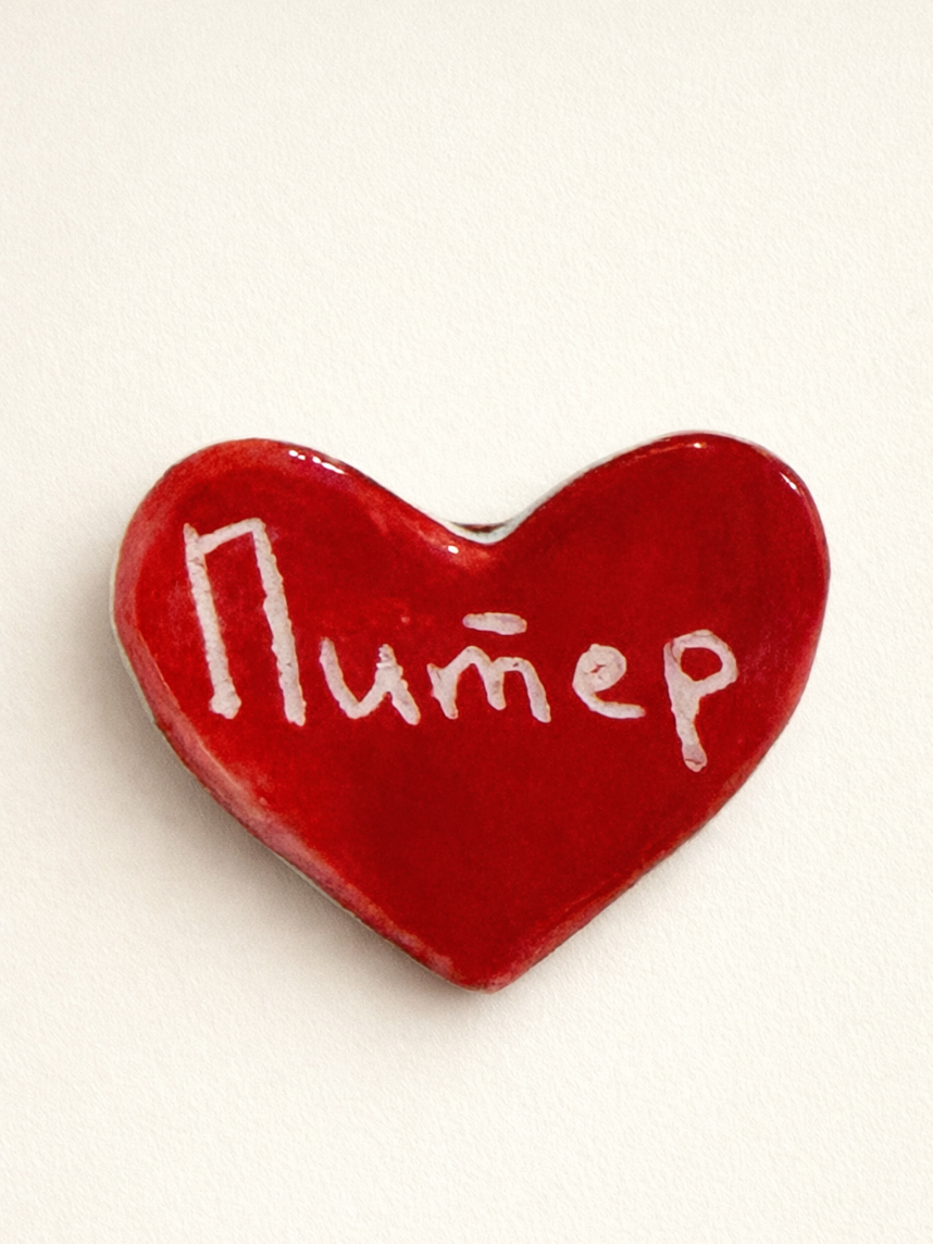 Маленькая аккуратная брошь примерно 3 см в виде сердца с надписью «Питер». Миниатюрный символ любви на вашем пальто, сумке или в качестве элемента декора подчеркнет вашу индивидуальность.