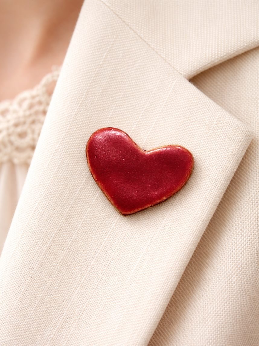 Брошь ручной работы Сердце, красная матовая, керамика