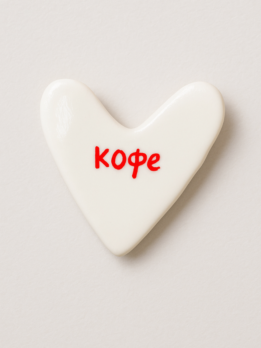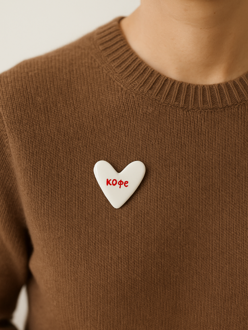 Брошь ручной работы Сердце с надписью «Кофе», полимерная глина