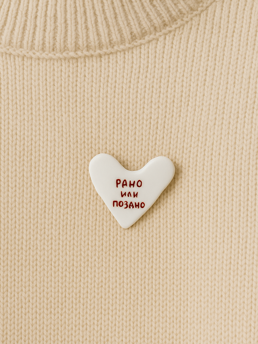 Брошь ручной работы Сердце с надписью «Рано или поздно», полимерная глина