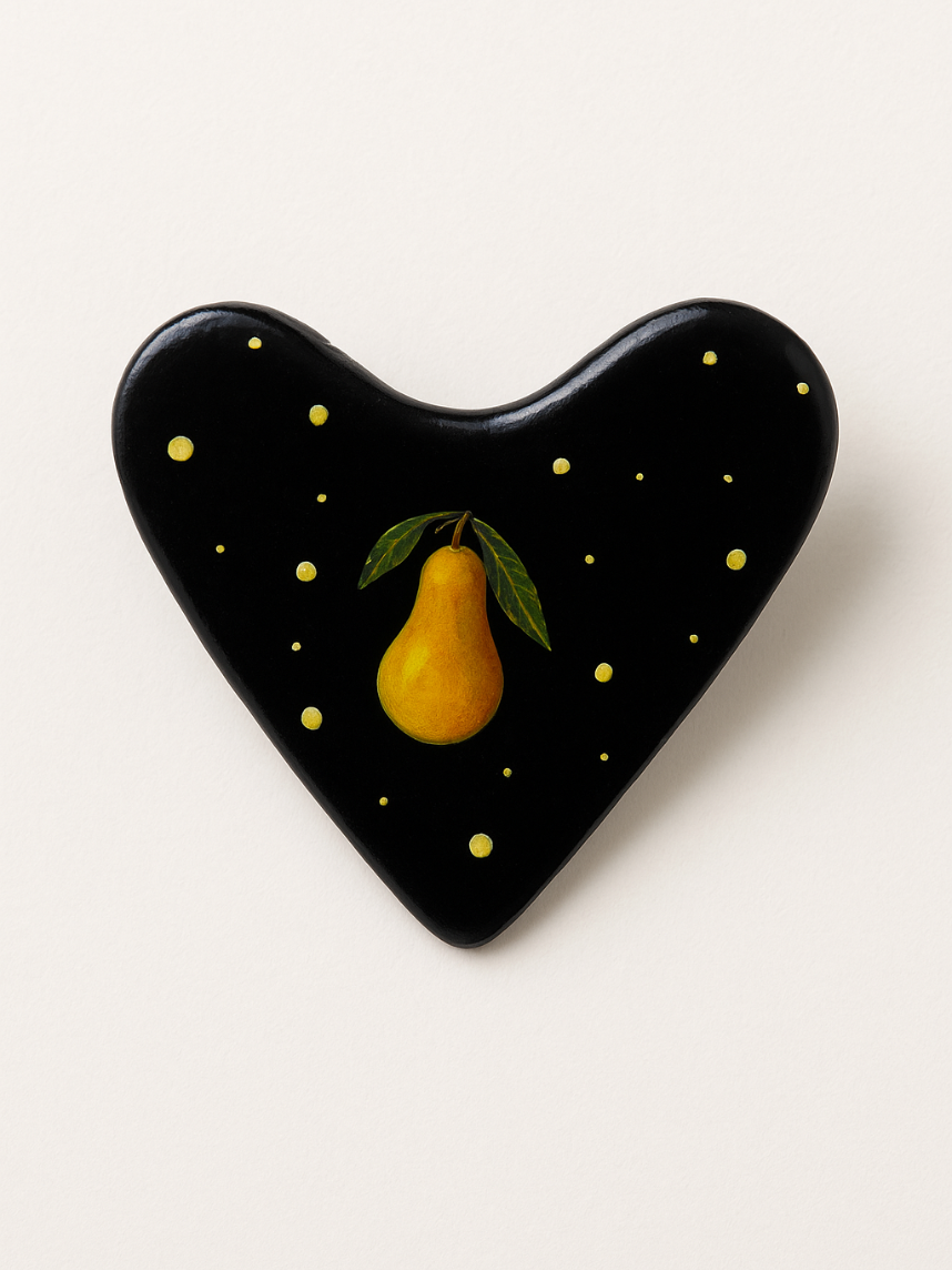 Брошь ручной работы Сердце в горошек с грушей, чёрная, полимерная глина