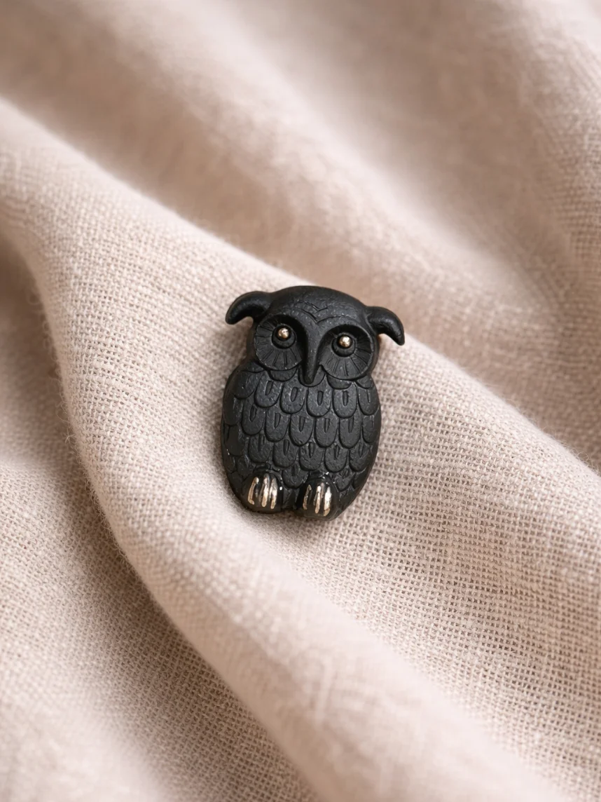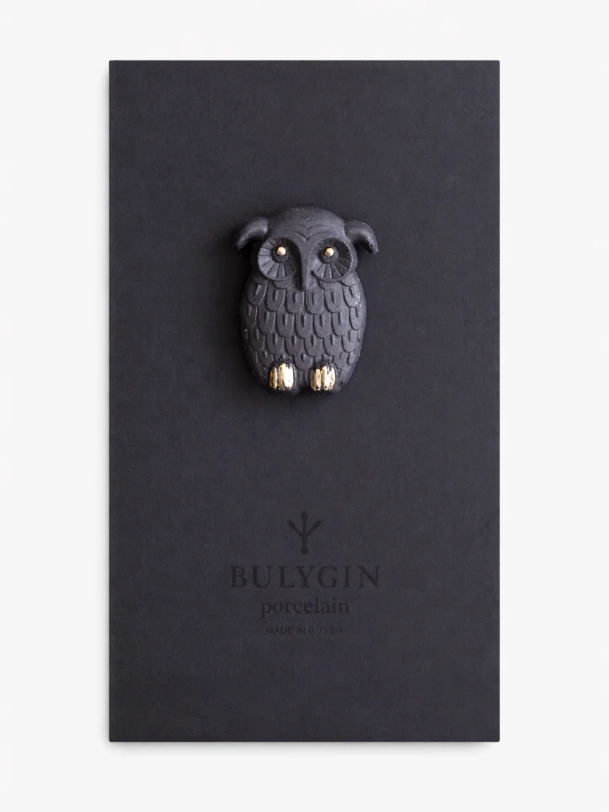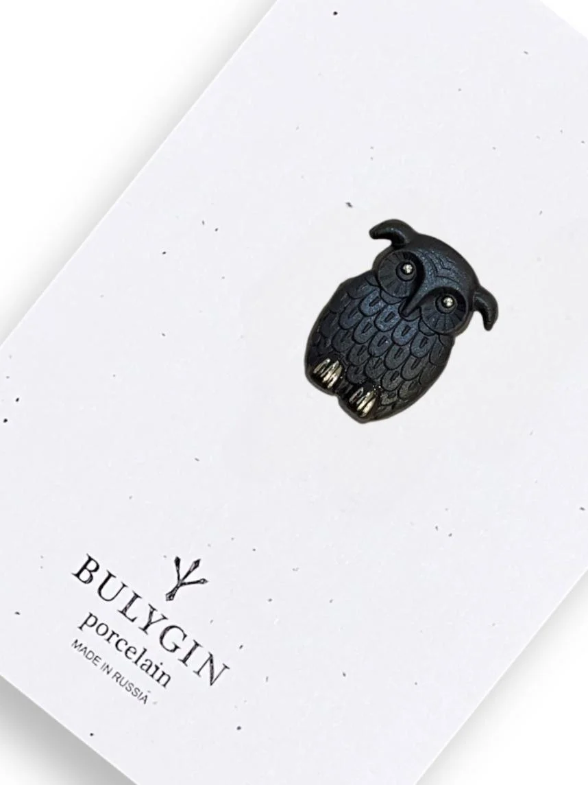 Фарфоровая брошь «Сова» в чёрно-серебряном цвете.