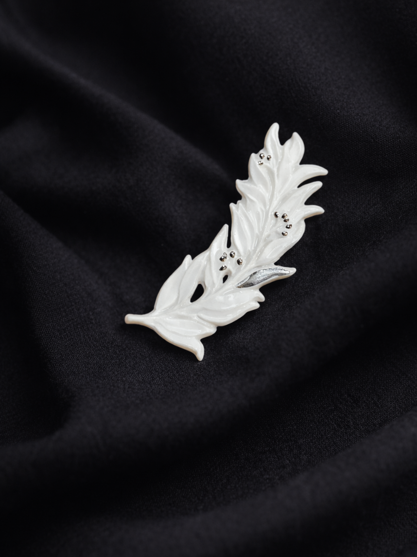 Фарфоровая брошь «Веточка оливы» бело-серебристого цвета.