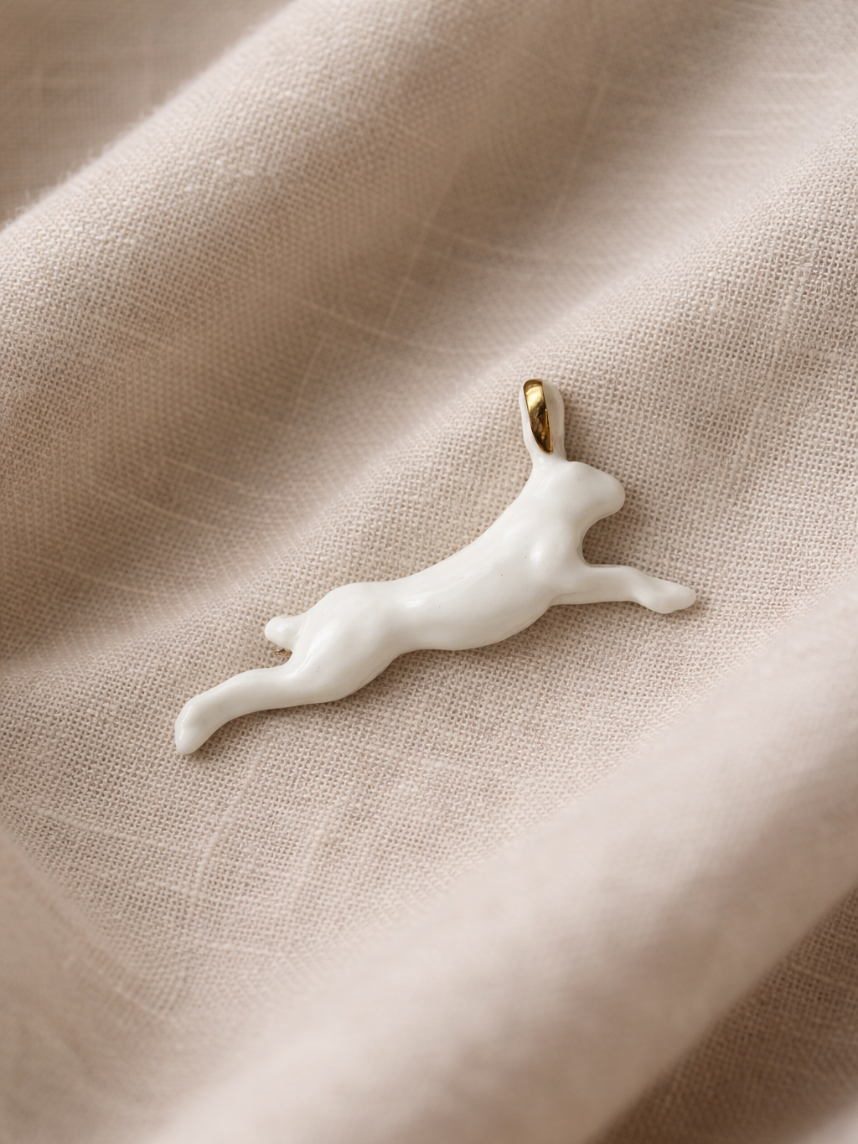 Фарфоровая брошь «Заяц» в бело-золотистом цвете.