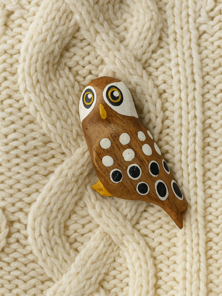 Брошь «Сычик» от бренда Free in tree - деревянная ручной работы с росписью. Это идеальный аксессуар для любителей живой природы.