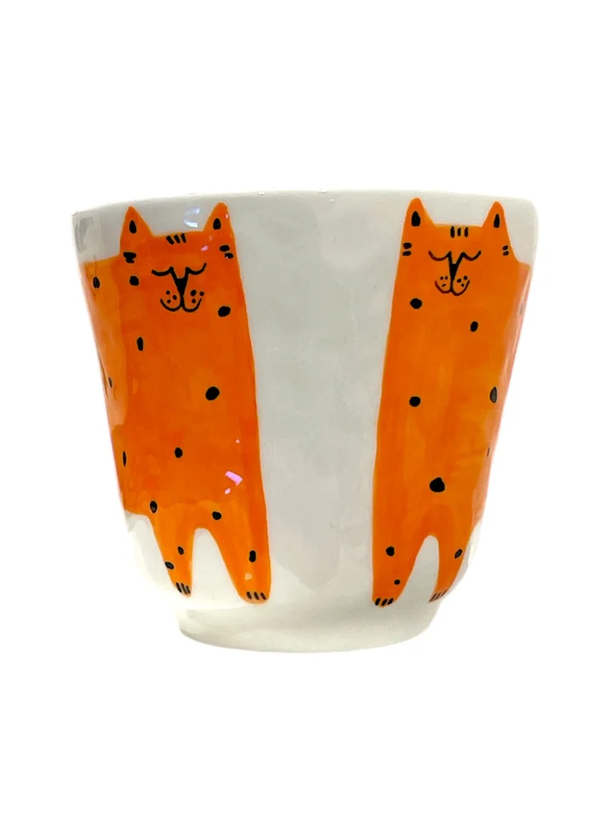Керамическая кружка ручной работы Кот оранжевая от Shushi Сeramics. Этому бренду посуды и декора для дома характерны простые формы, яркие цвета и узоры, похожие на детские рисунки: цветочки, фрукты, неидеальные линии геометрических фигур.