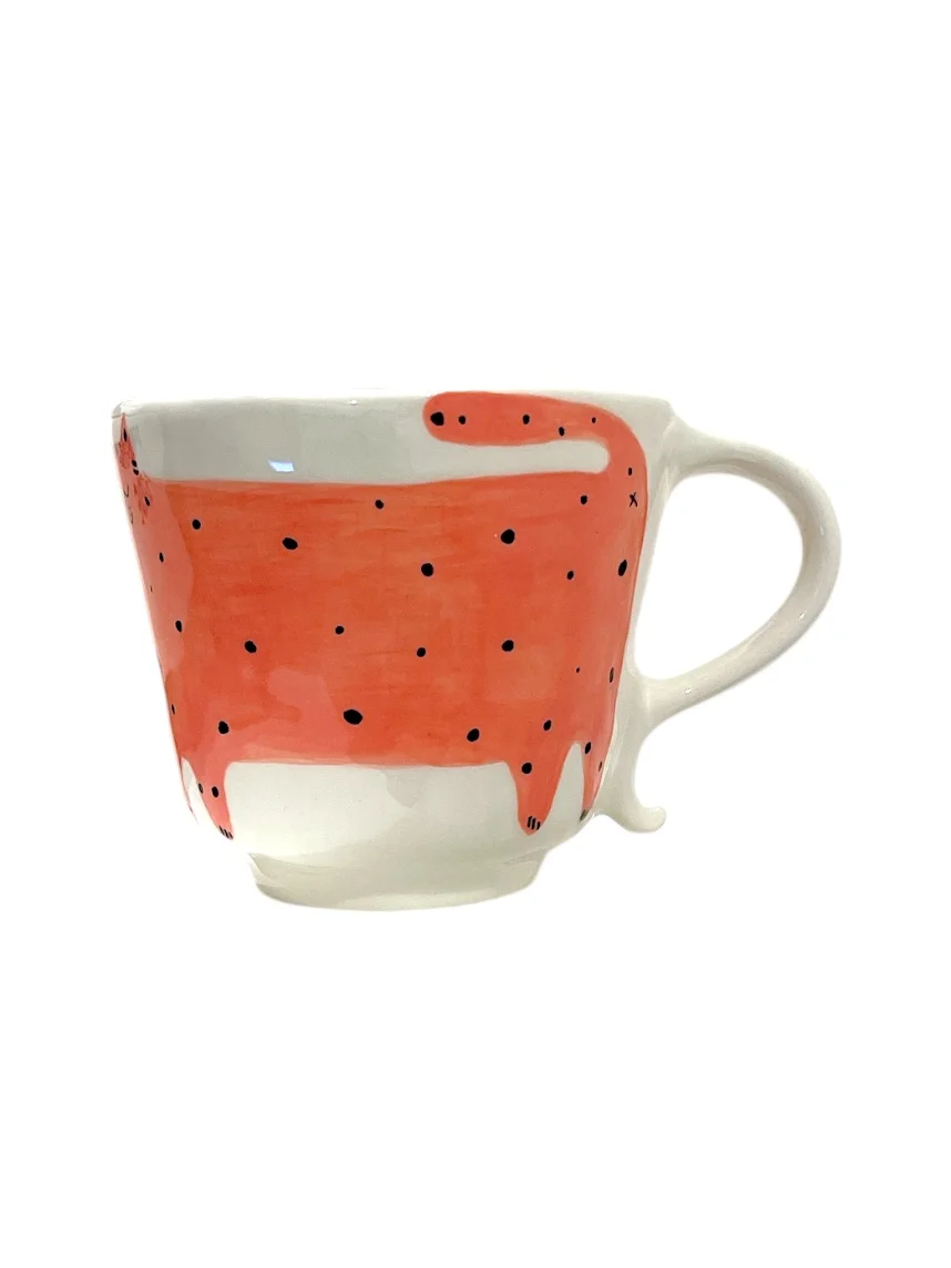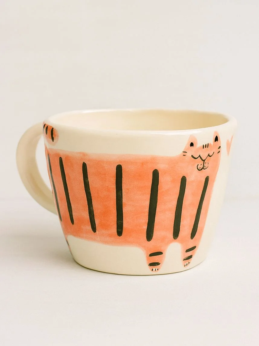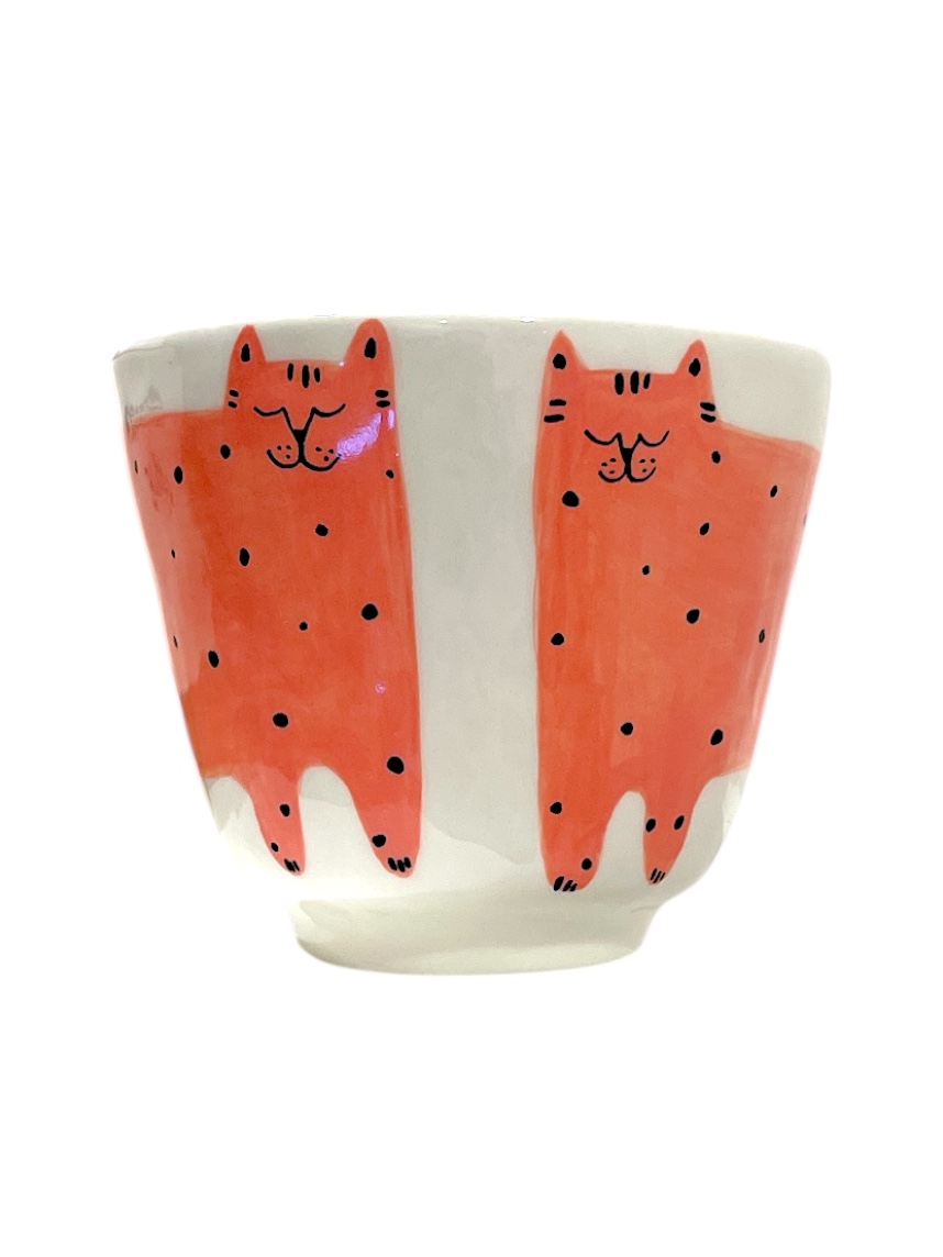 Керамическая кружка ручной работы «Кот», розовый от Shushi Сeramics. Этому бренду посуды и декора для дома характерны простые формы, яркие цвета и узоры, похожие на детские рисунки: цветочки, фрукты, неидеальные линии геометрических фигур.