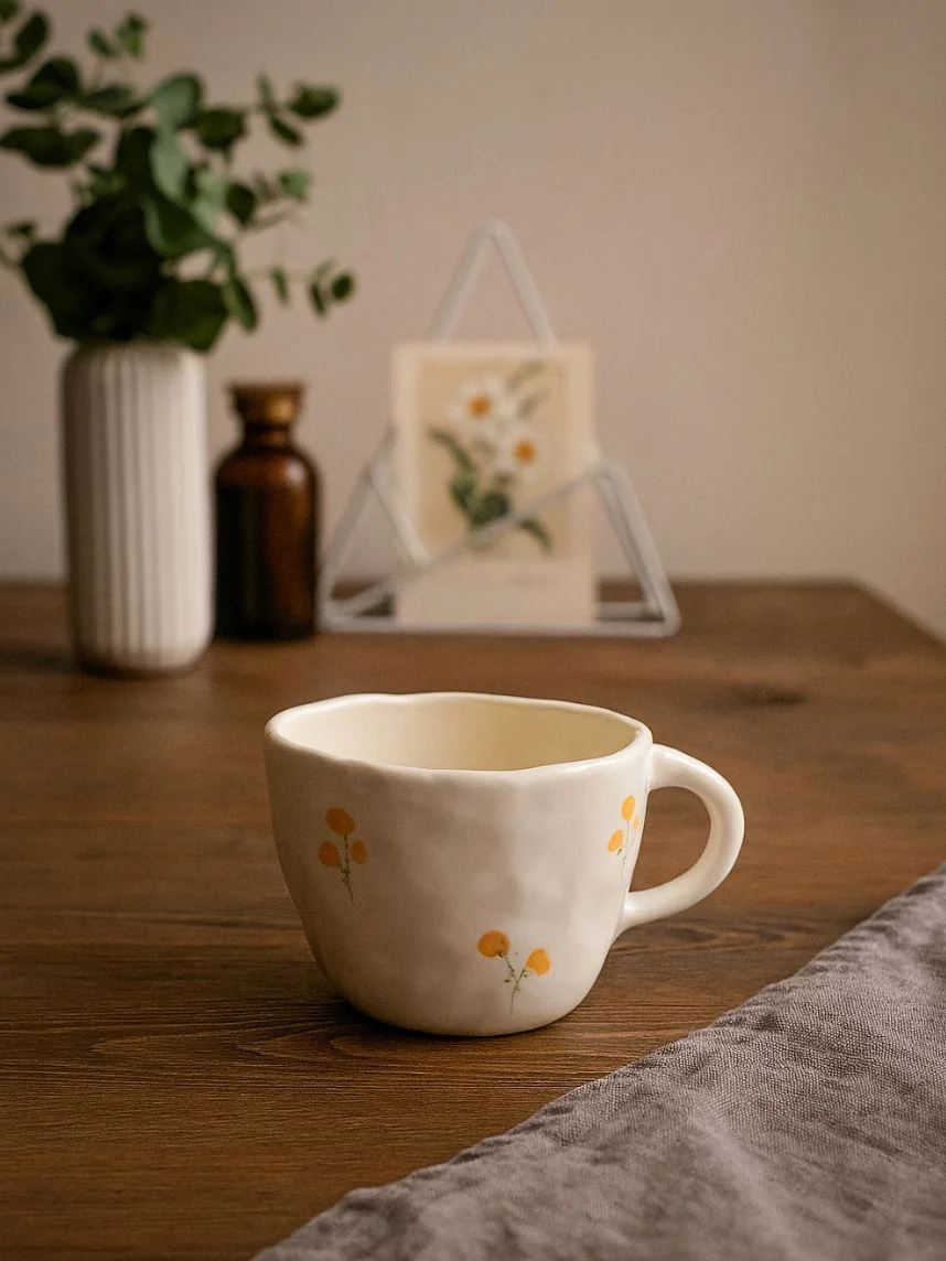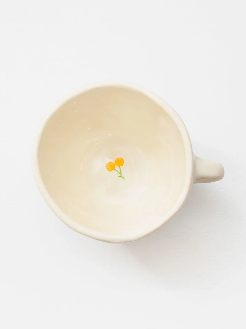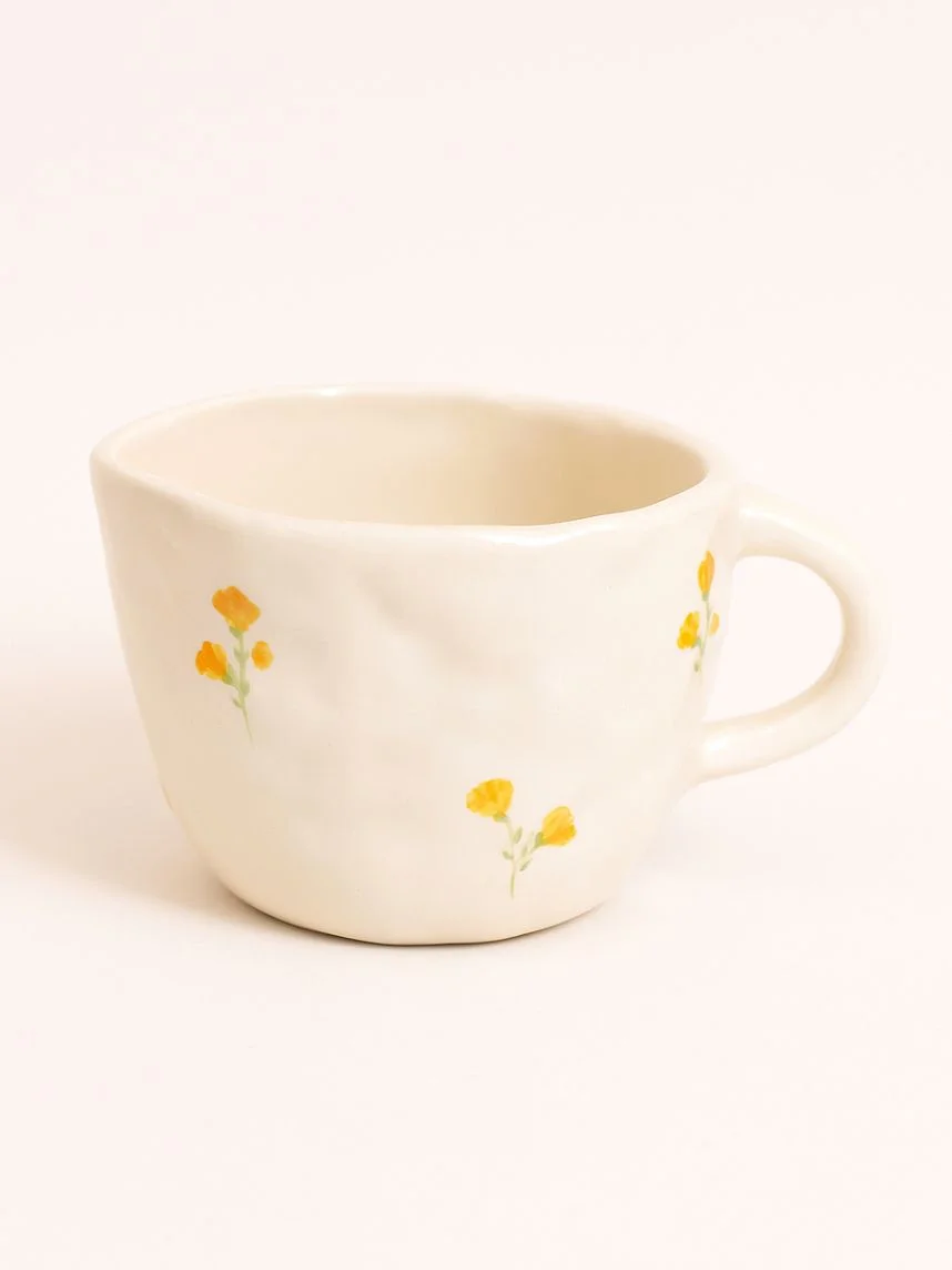 Керамическая кружка ручной работы Цветочки оранжевые от Shushi Сeramics. Этому бренду посуды и декора для дома характерны простые формы, яркие цвета и узоры, похожие на детские рисунки: цветочки, фрукты, неидеальные линии геометрических фигур.