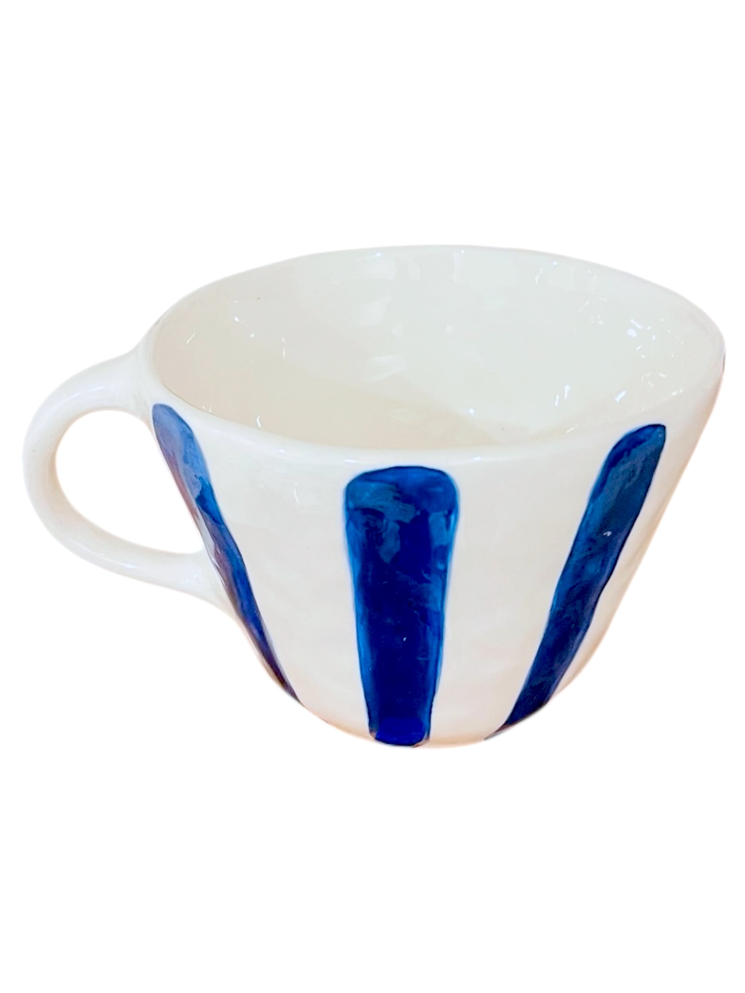 Керамическая кружка ручной работы Полоски синяя от Shushi Сeramics. Этому бренду посуды и декора для дома характерны простые формы, яркие цвета и узоры, похожие на детские рисунки: цветочки, фрукты, неидеальные линии геометрических фигур.