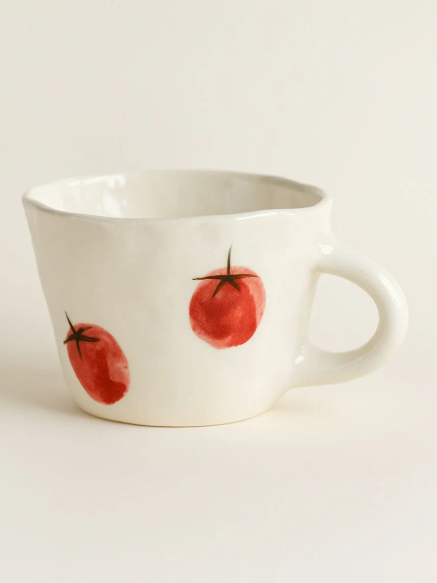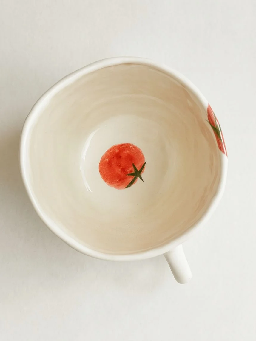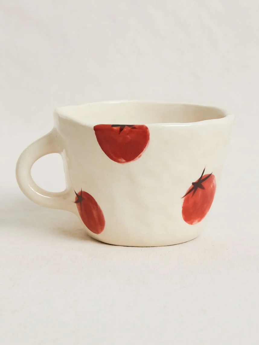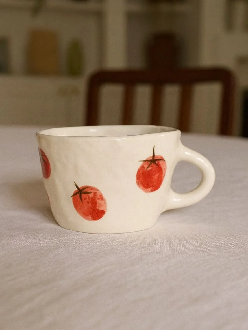 Керамическая кружка ручной работы Помидоры, красная от Shushi Сeramics. Этому бренду посуды и декора для дома характерны простые формы, яркие цвета и узоры, похожие на детские рисунки: цветочки, фрукты, неидеальные линии геометрических фигур.