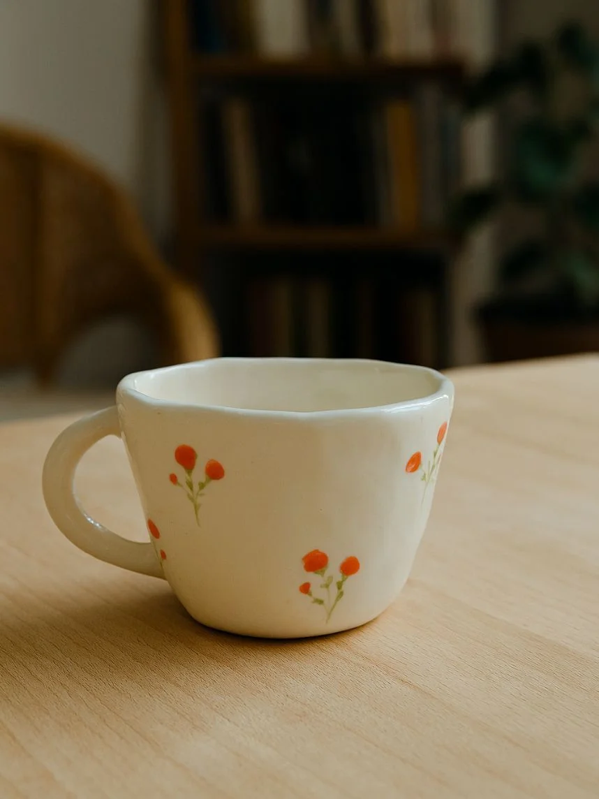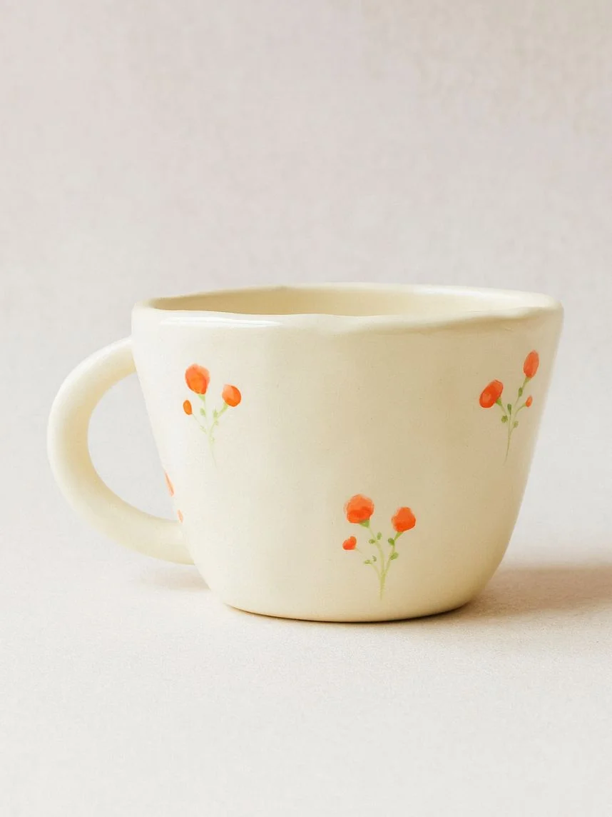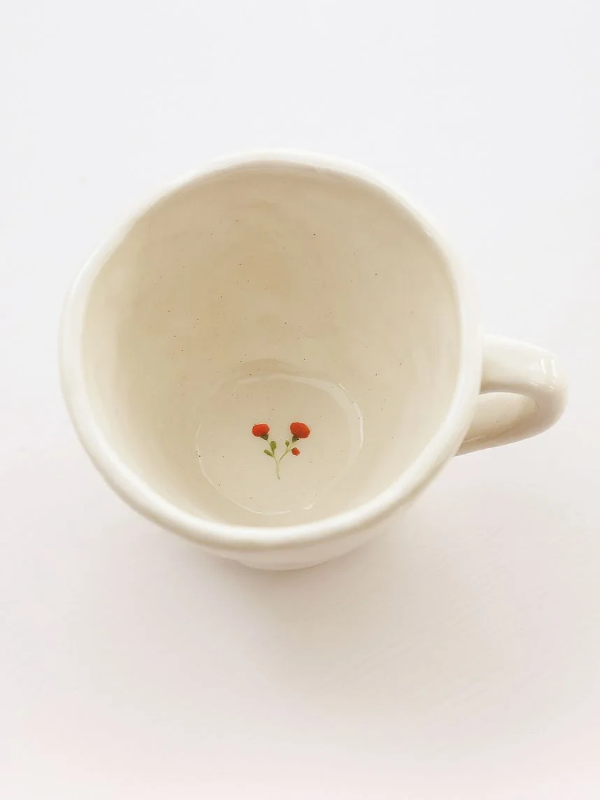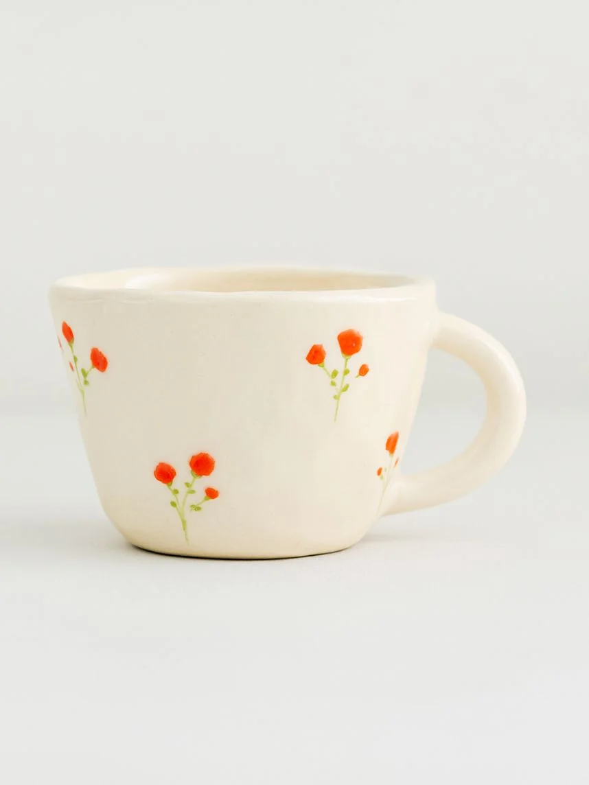 Керамическая кружка ручной работы Розы красные от Shushi Сeramics. Этому бренду посуды и декора для дома характерны простые формы, яркие цвета и узоры, похожие на детские рисунки: цветочки, фрукты, неидеальные линии геометрических фигур.