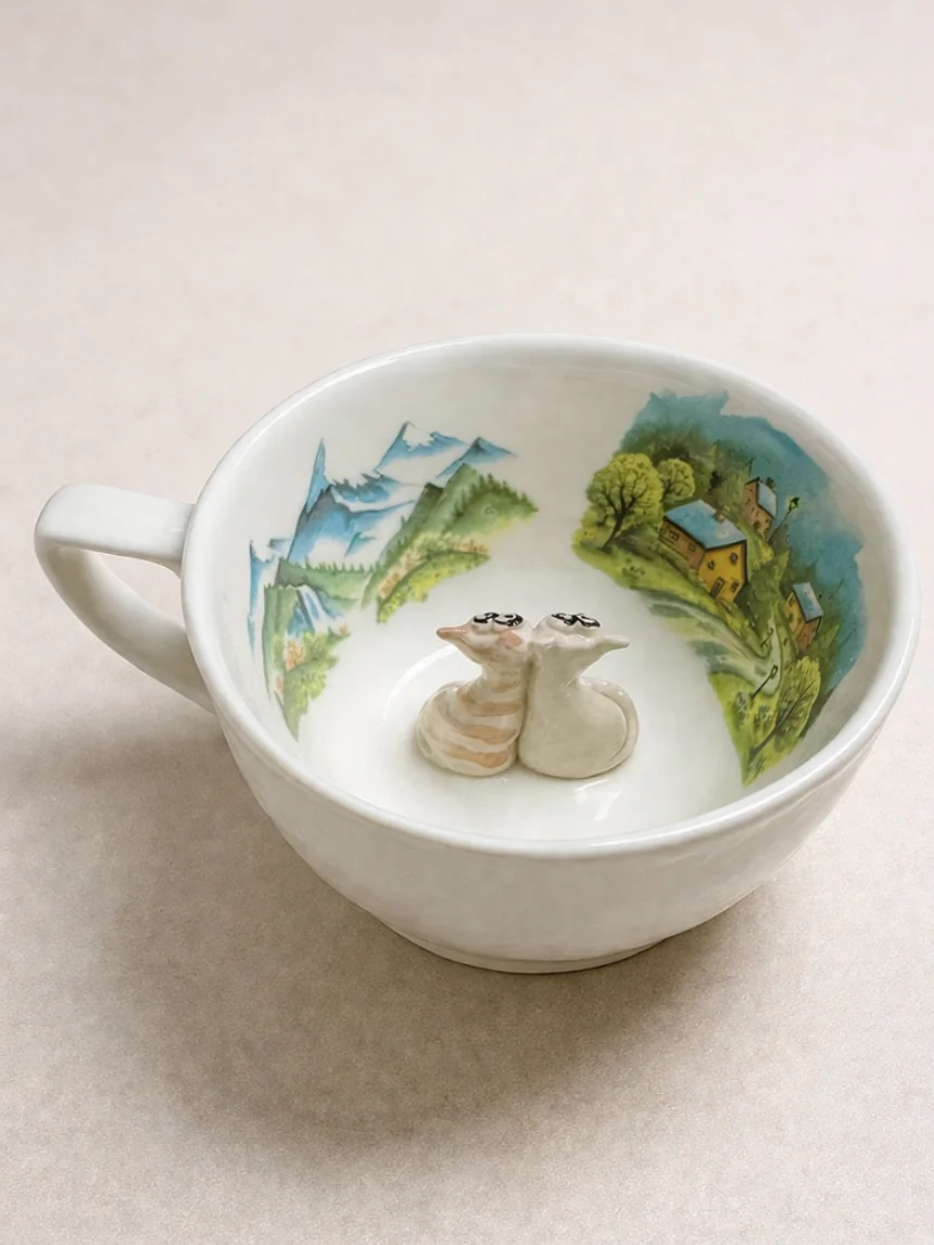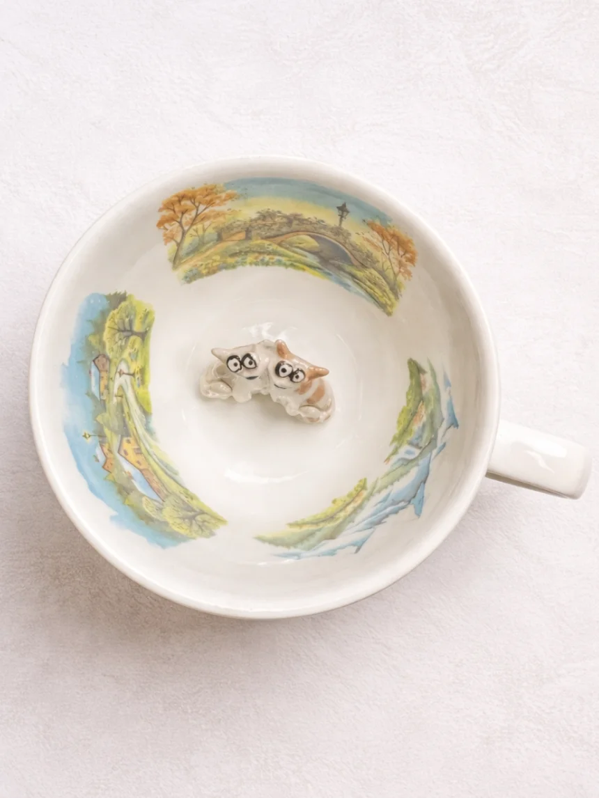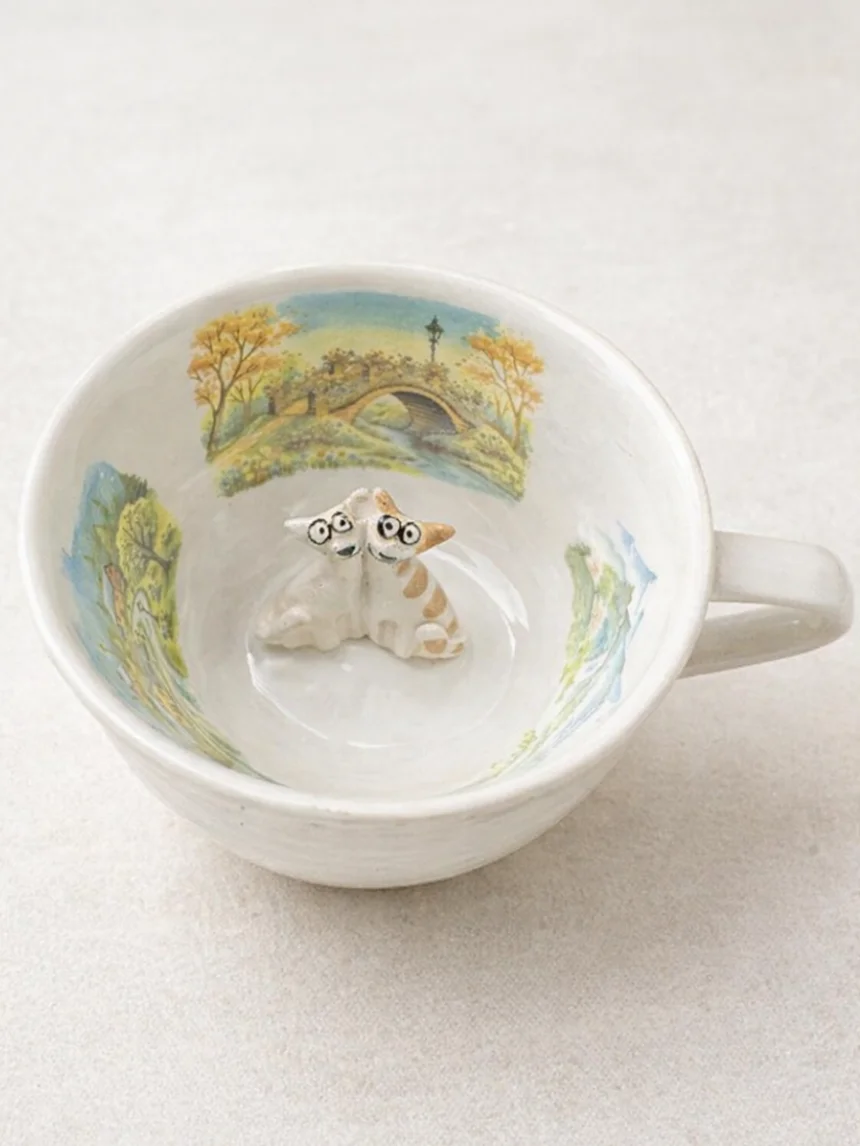 Чашка для чая ручной работы Мадам де Тюль с фигуркой внутри Котики с домиками, фарфор, 250 мл