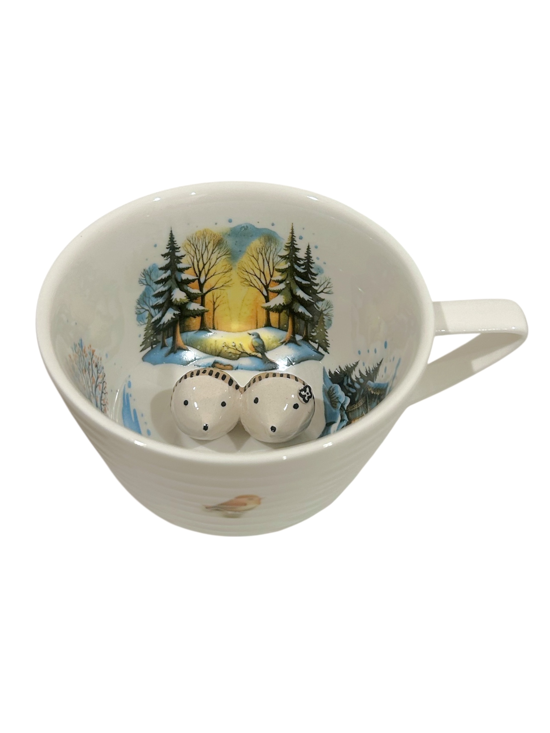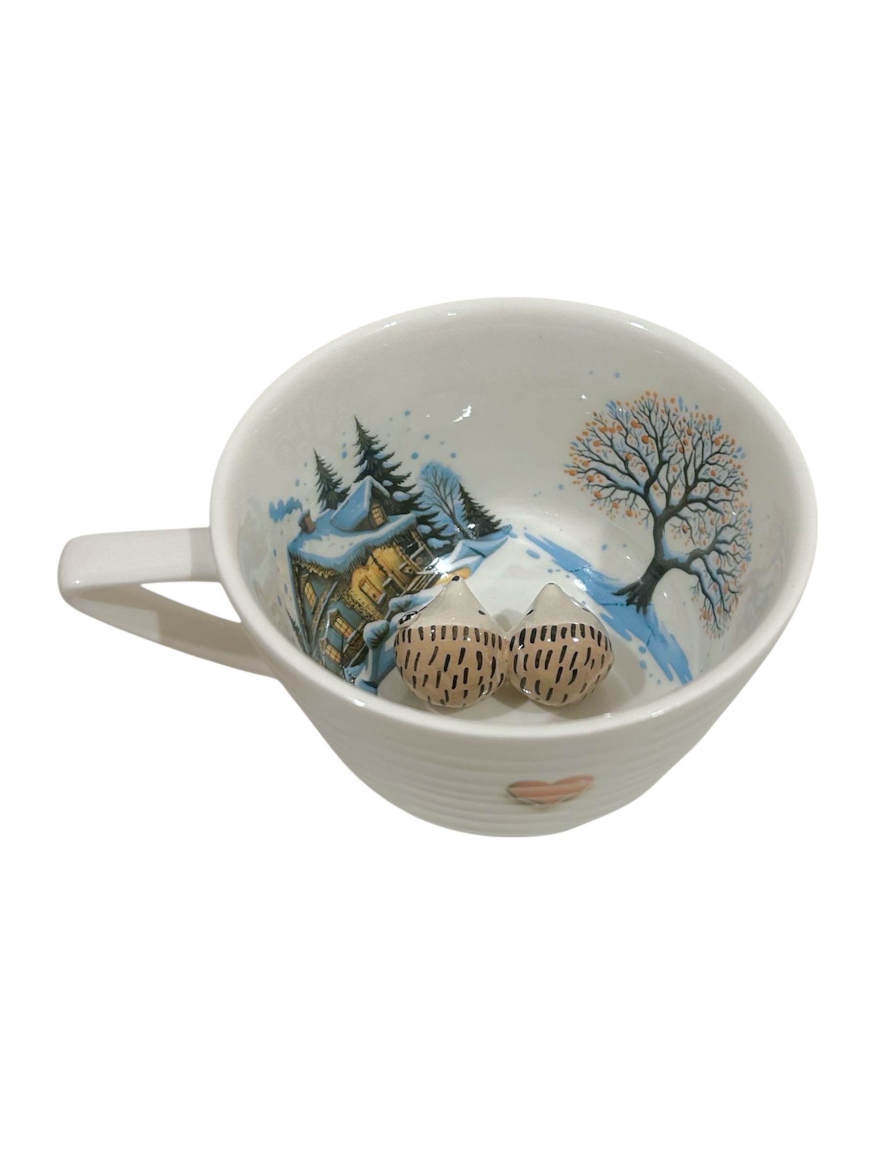 Чашка для чая ручной работы с фигуркой внутри «Пара ёжиков у зимнего дома».