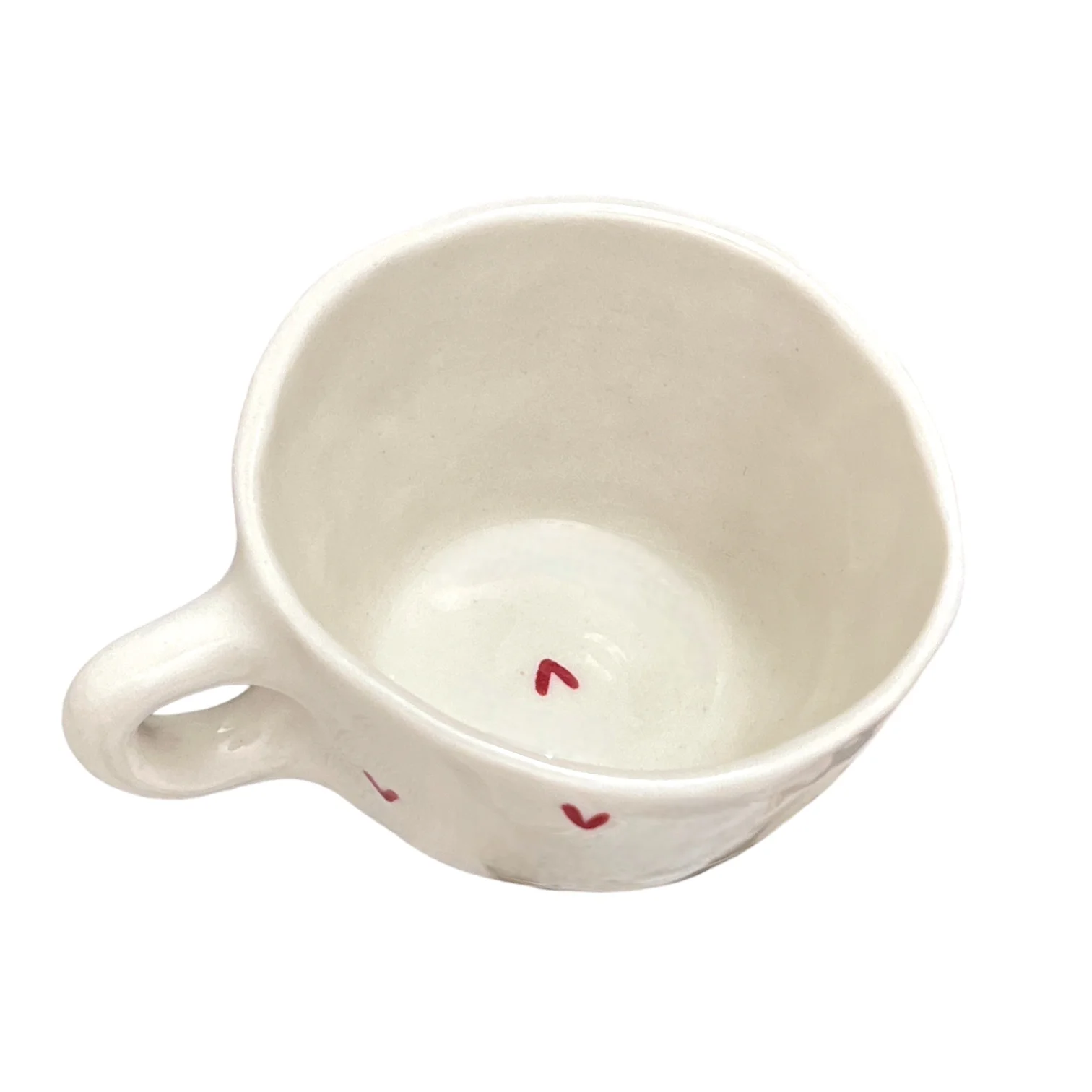 Керамическая кружка ручной работы Сердечки красные от Shushi Сeramics. Этому бренду посуды и декора для дома характерны простые формы, яркие цвета и узоры, похожие на детские рисунки: цветочки, фрукты, неидеальные линии геометрических фигур.
