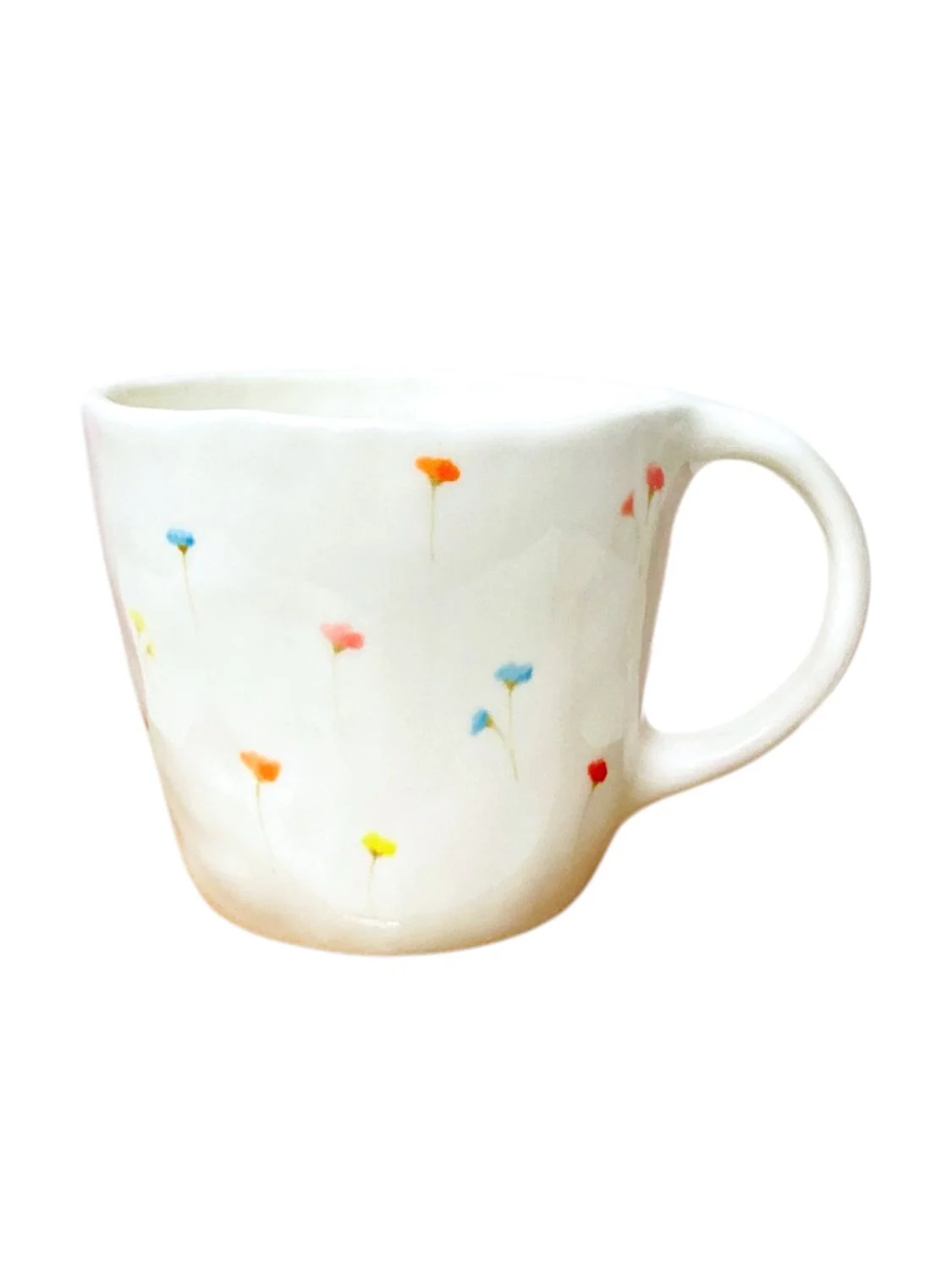 Керамическая кружка ручной работы Цветочки разноцветные от Shushi Сeramics. Этому бренду посуды и декора для дома характерны простые формы, яркие цвета и узоры, похожие на детские рисунки: цветочки, фрукты, неидеальные линии геометрических фигур.