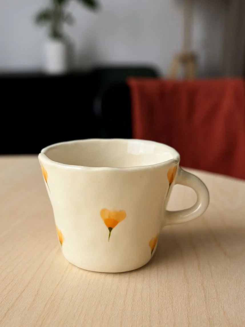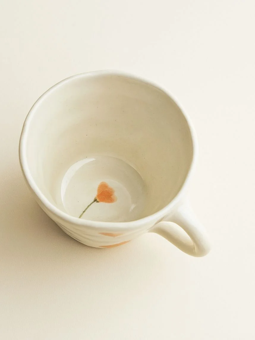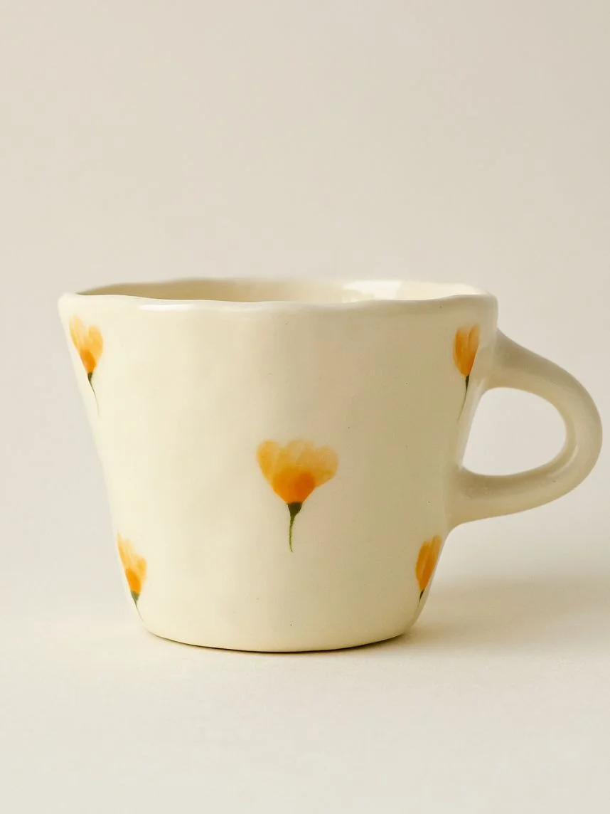 Керамическая кружка ручной работы Цветочки оранжевые от Shushi Сeramics. Этому бренду посуды и декора для дома характерны простые формы, яркие цвета и узоры, похожие на детские рисунки: цветочки, фрукты, неидеальные линии геометрических фигур.