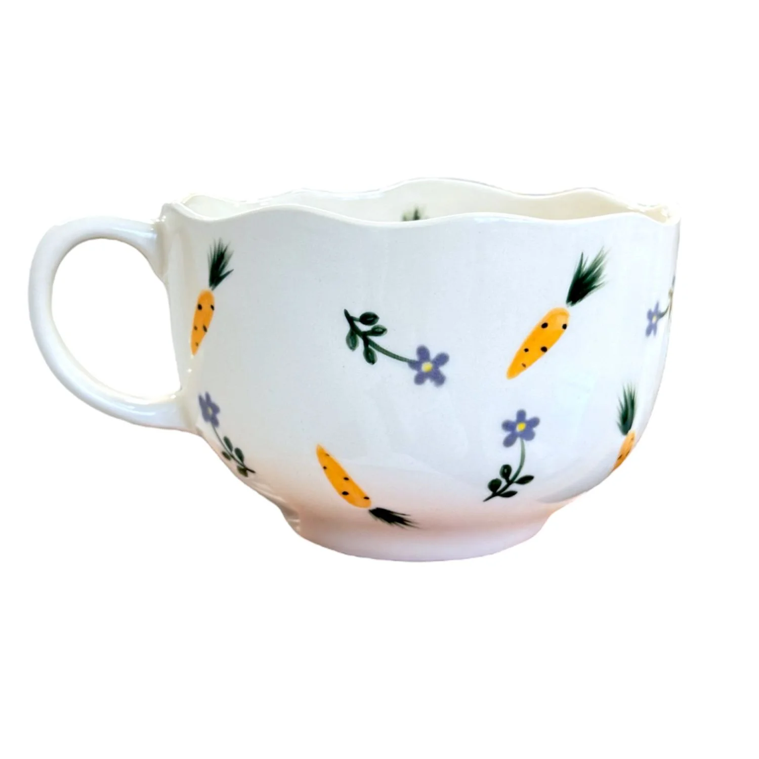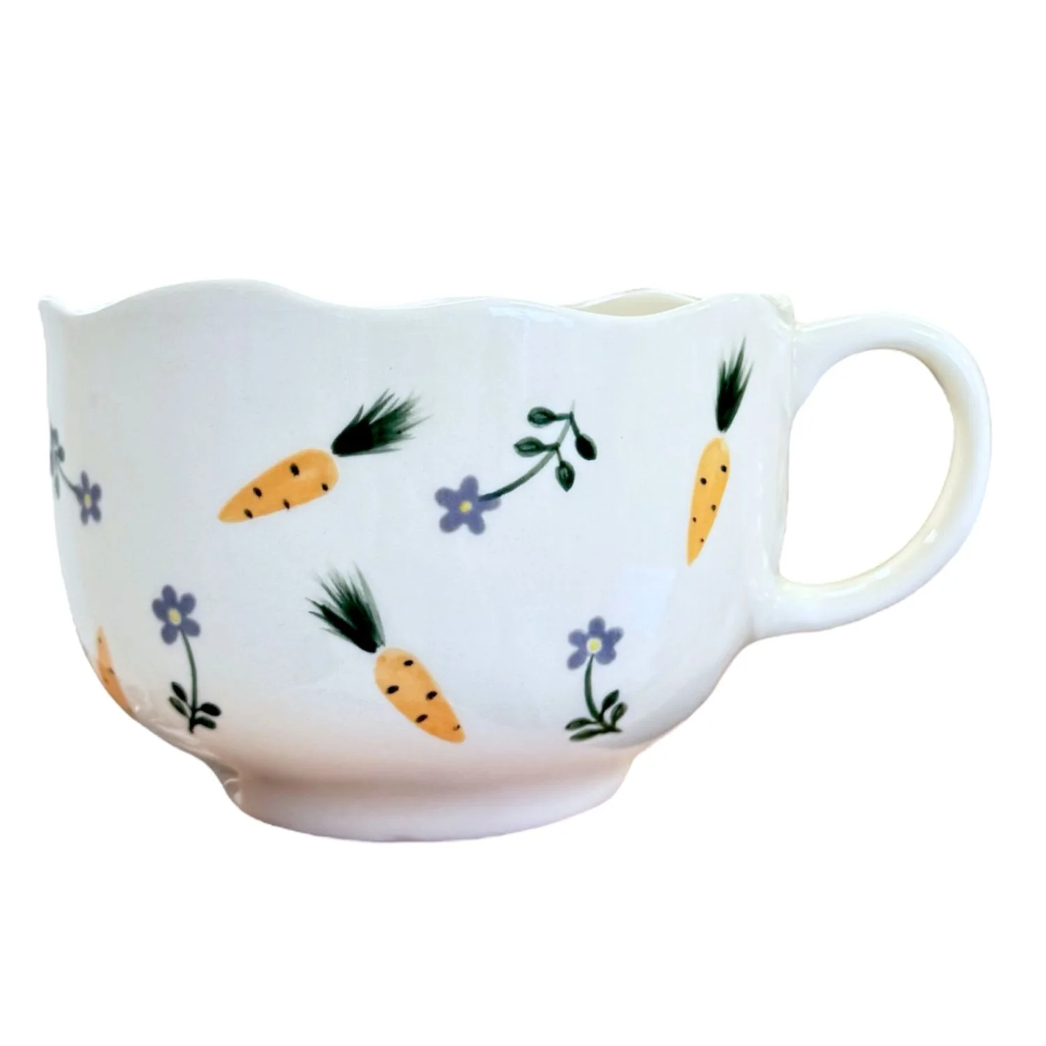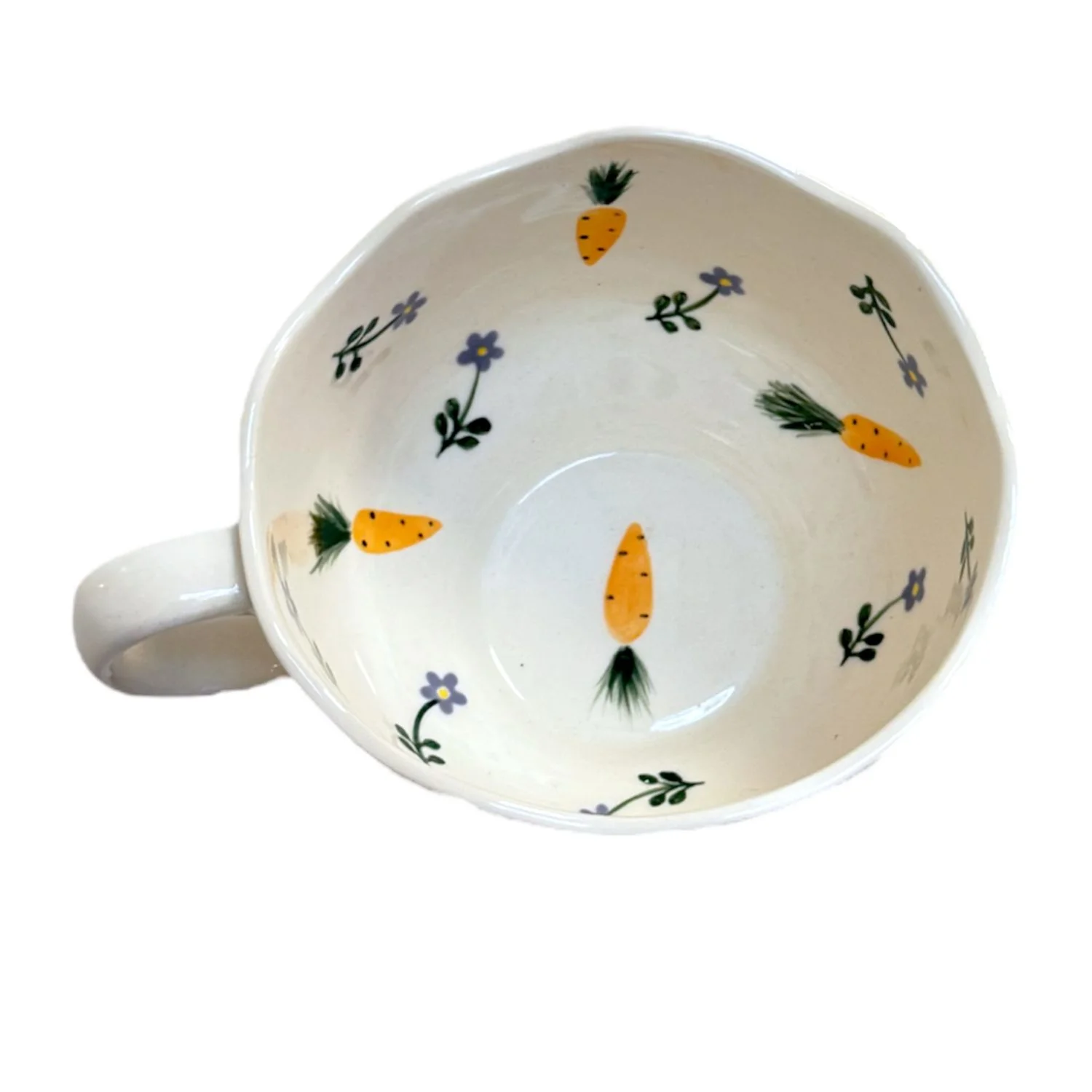 Чашка для чая ручной работы Slowday Ceramics в сиреневый цветочек и морковку «Винтаж», белая, полуфарфор, 600 мл