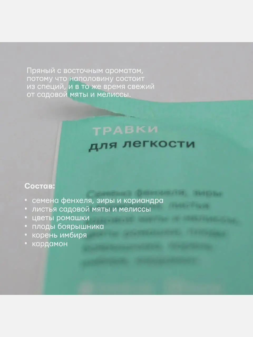 • Состав: Семена фенхеля, зиры и кориандра, листья садовой мяты и мелиссы, цветы ромашки, плоды боярышника, корень имбиря, кардамон.