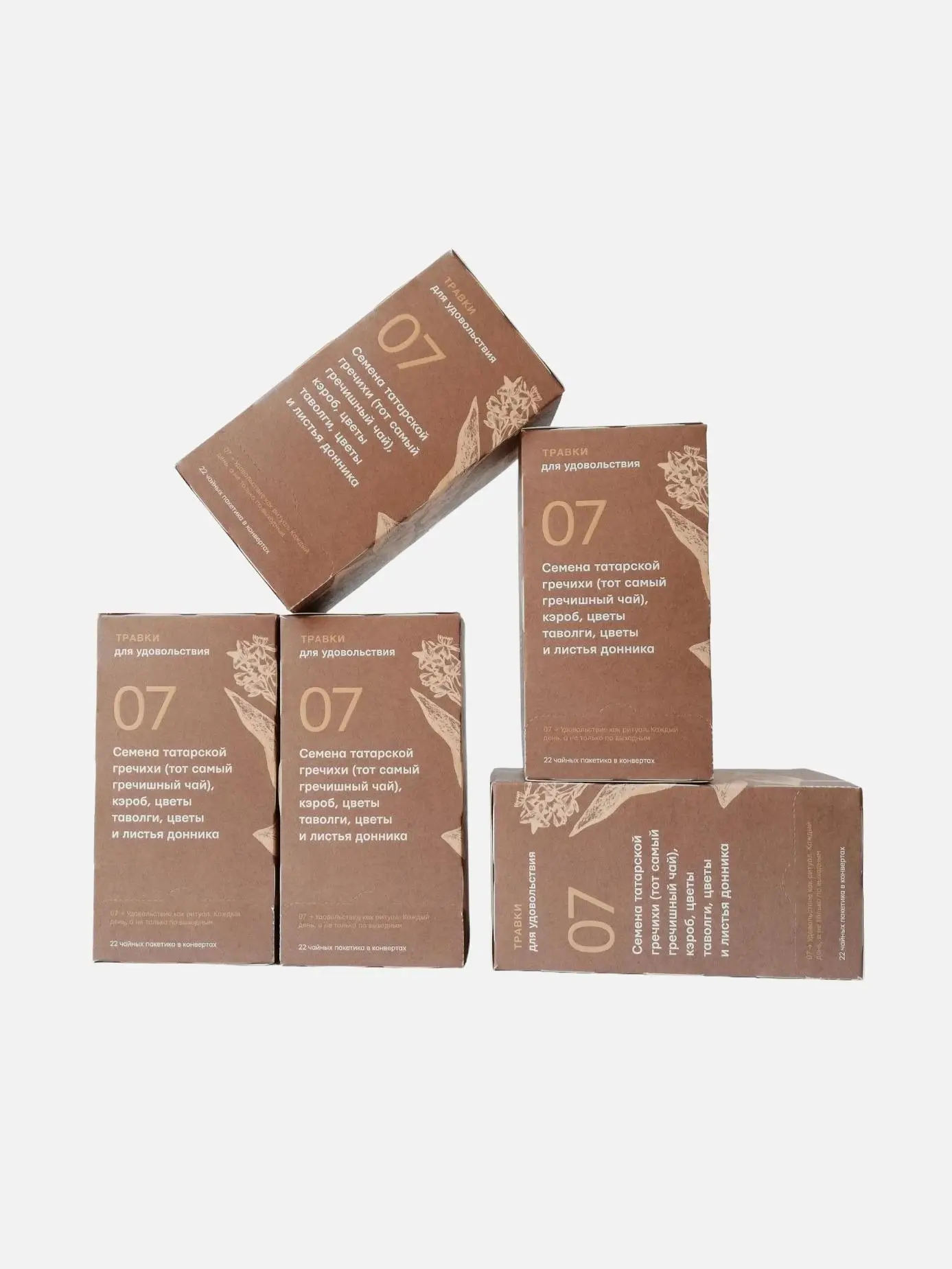 • Состав: Семена татарской гречихи (тот самый гречишный чай), кэроб, цветы таволги, цветы и листья донника.