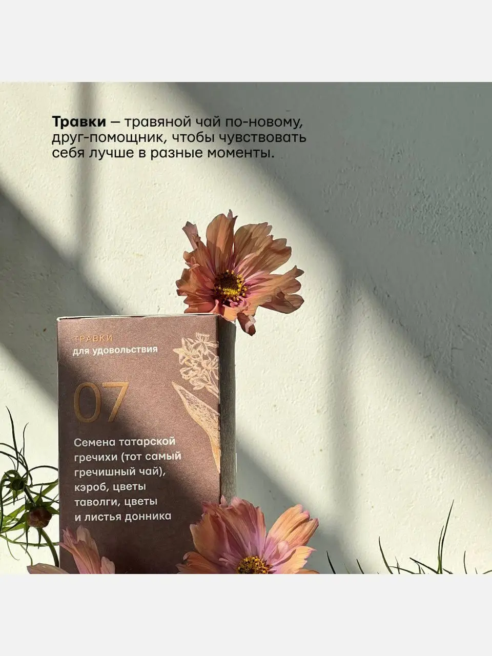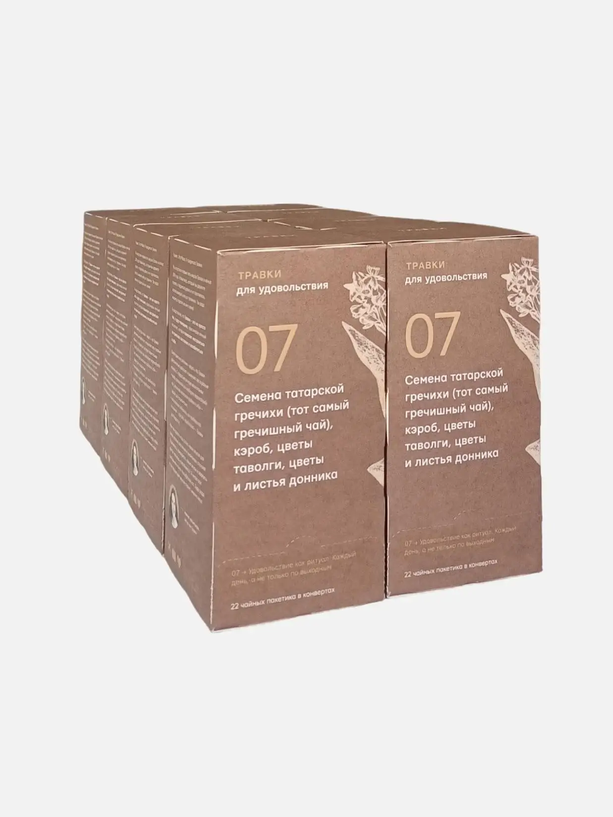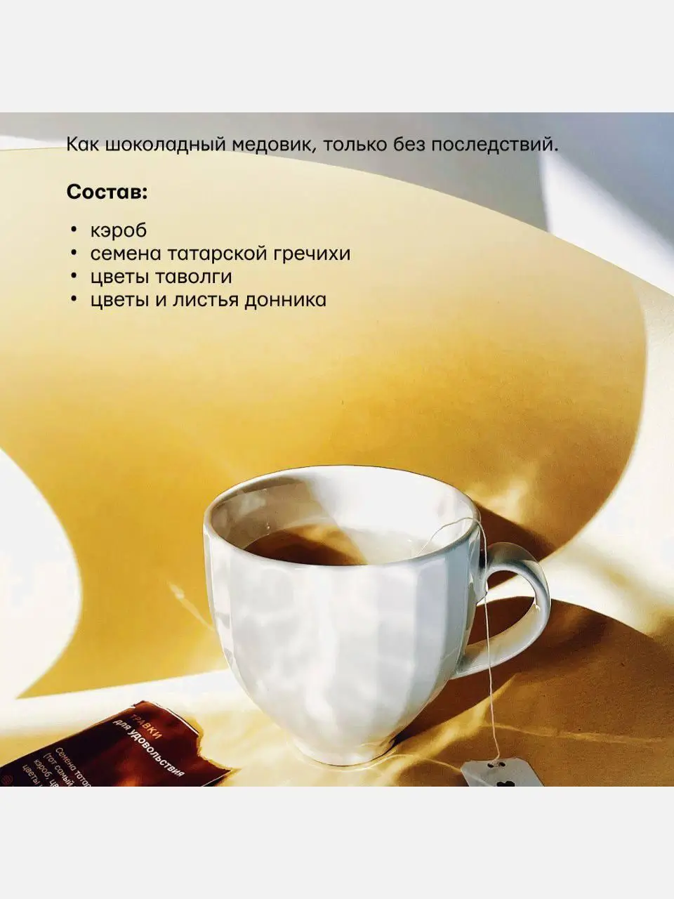 • Состав: Семена татарской гречихи (тот самый гречишный чай), кэроб, цветы таволги, цветы и листья донника.