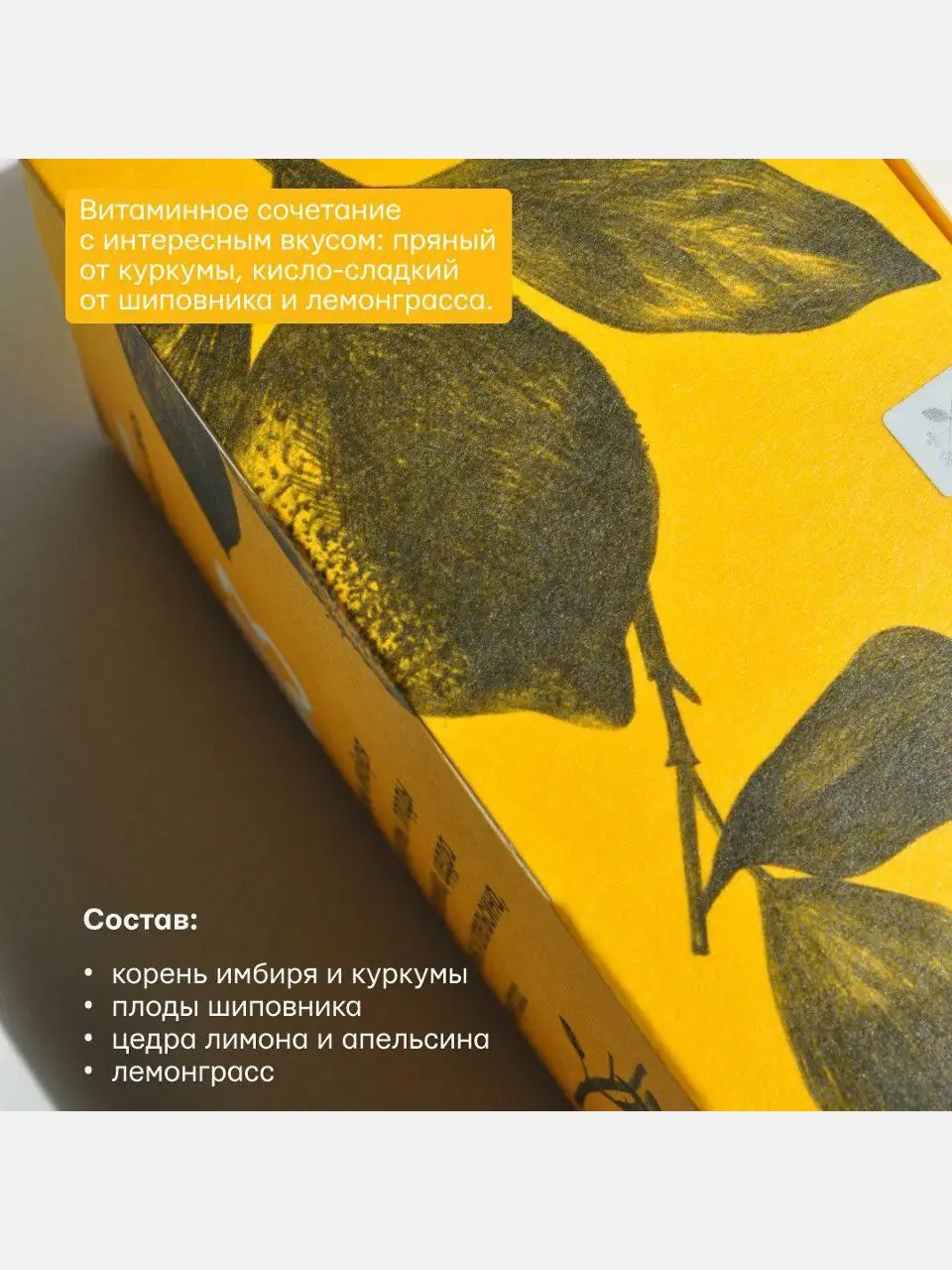 • Состав: Корень имбиря и куркумы, плоды шиповника, цедра лимона и апельсина, лемонграсс.