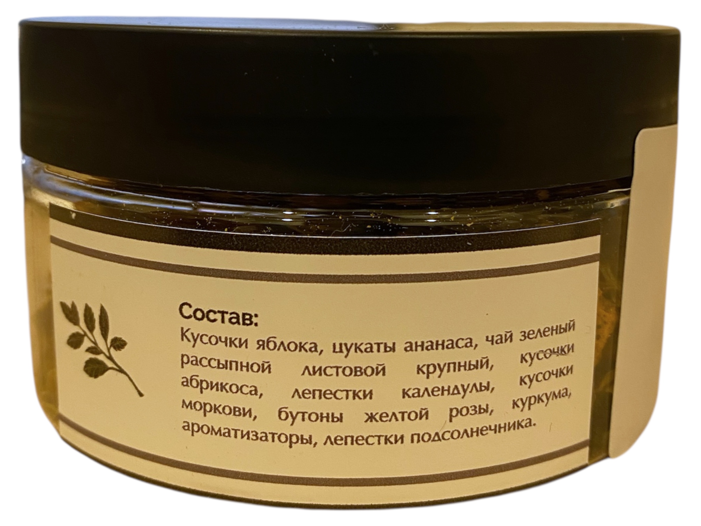• Состав: Кусочки яблока, цукаты ананаса, чай зелёный рассыпной листовой крупный, кусочки абрикоса, лепестки календулы, кусочки моркови, бутоны жёлтой розы, куркума, ароматизаторы, лепестки подсолнечника.