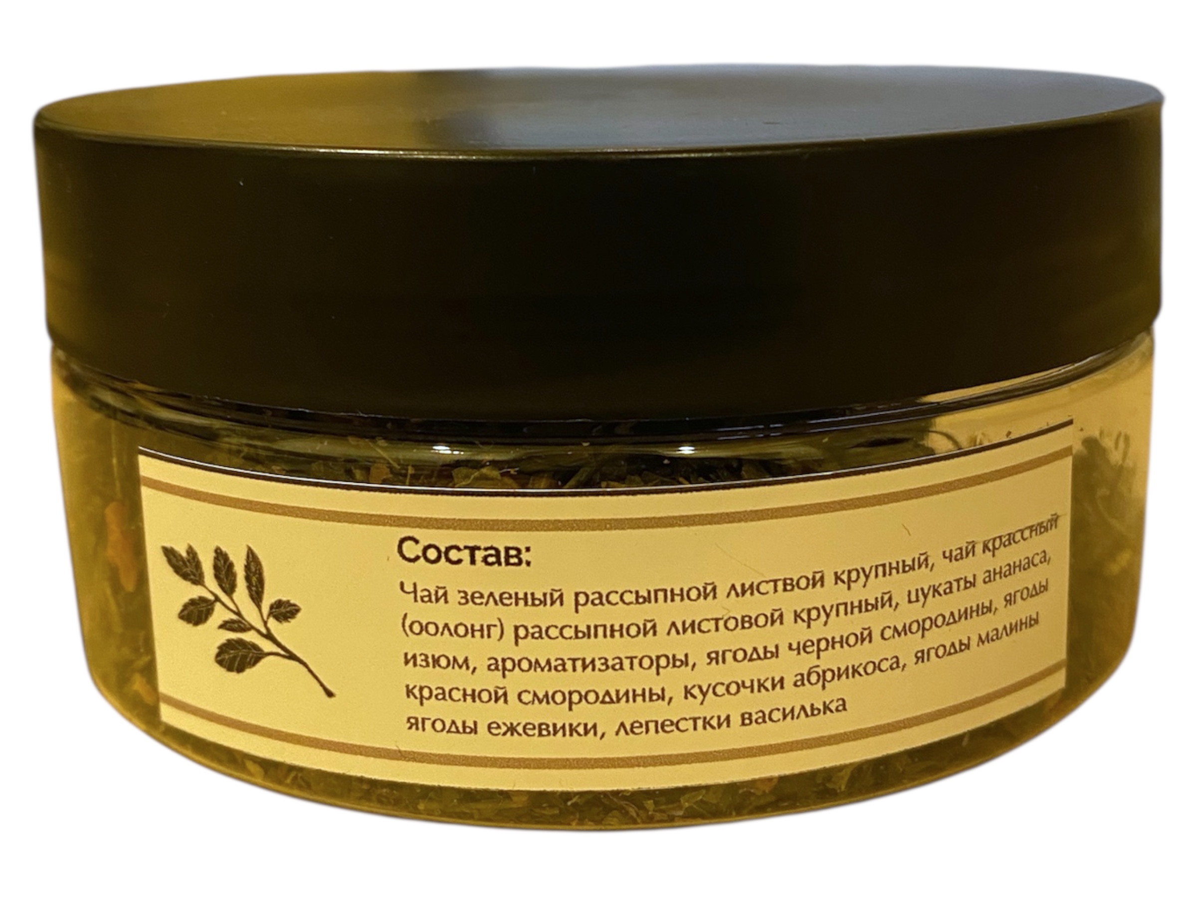• Состав: Чай зелёный крупнолистовой, чай красный ( оолонг) рассыпной листовой крупный, цукаты ананаса, изюм, ароматизаторы, ягоды черной смородины, ягоды красной смородины, кусочки абрикоса, ягоды малины, ягоды ежевики, лепестки василька