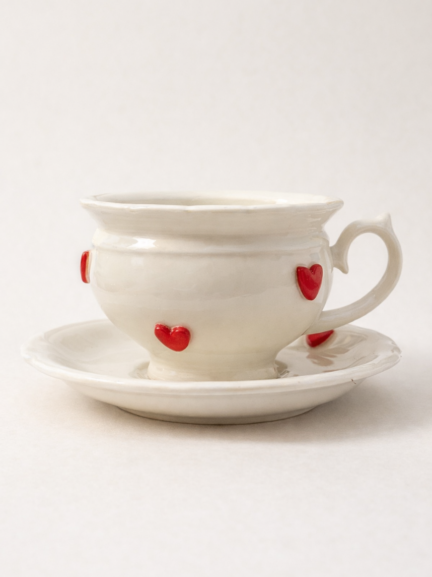 Чайная пара из полуфарфора под винтаж в красные сердечки. Ручная работа от петербургского бренда slowday_ceramics. Кружка объёмом 250 мл, блюдце диаметром 14 см.