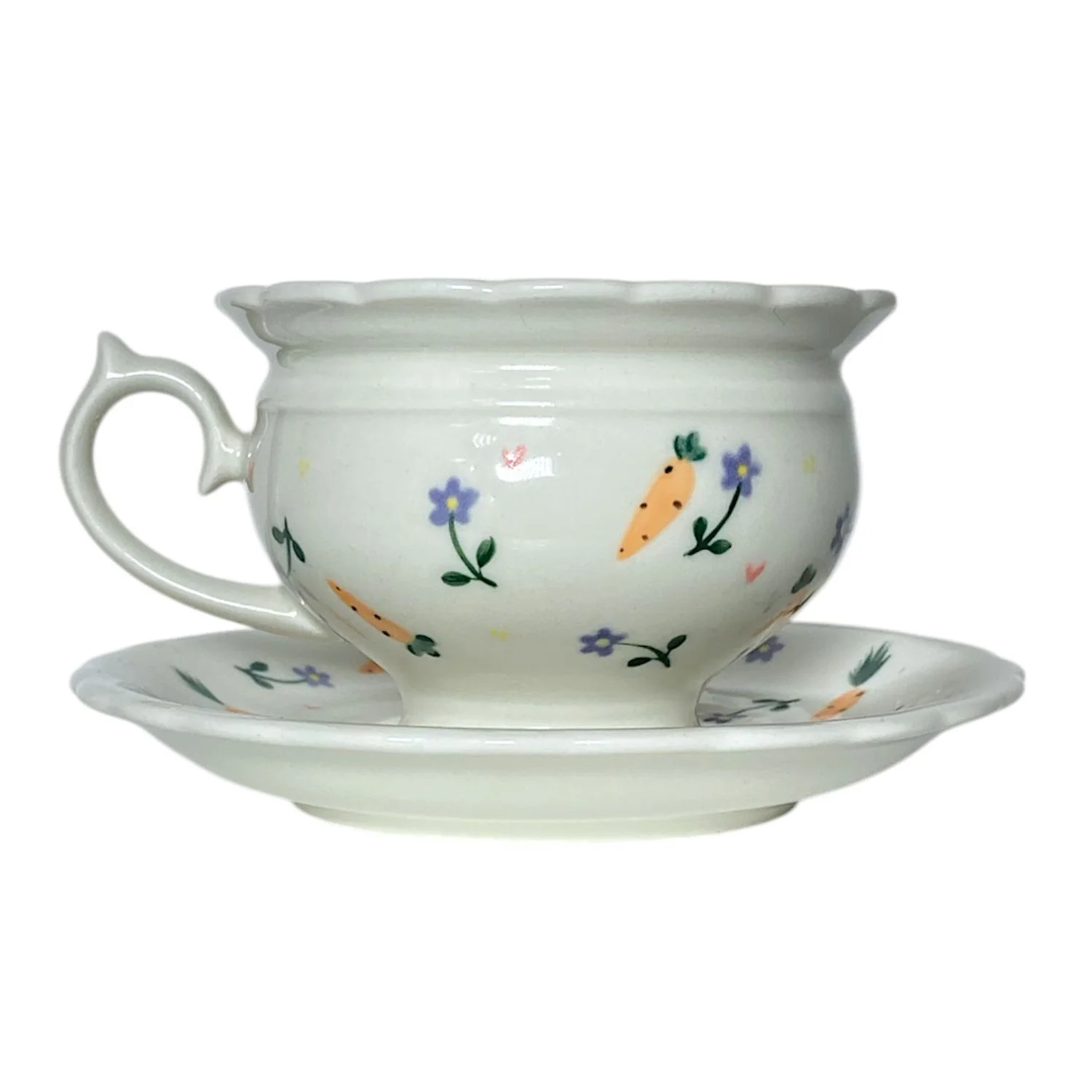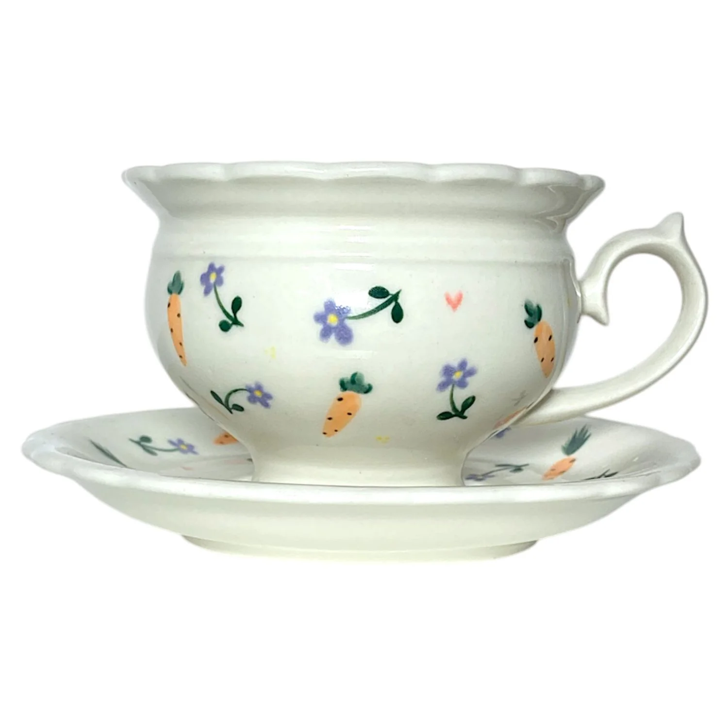 Чайная пара из полуфарфора под винтаж в морковки и сиреневые цветочки.  Ручная работа от петербургского бренда slowday_ceramics. Кружка объёмом 250 мл, блюдце диаметром 14 см.