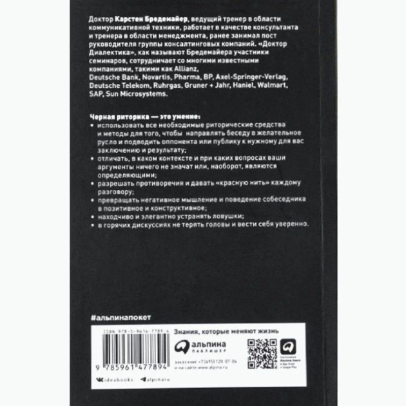 «Черная риторика. Власть и магия слова» - книга, которая откроет вам новые возможности в общении и переговорах. Автор, Карстен Бредемайер, признанный тренер № 1 в области коммуникативной техники, делится своими знаниями и опытом, чтобы помочь вам достичь желаемых результатов.