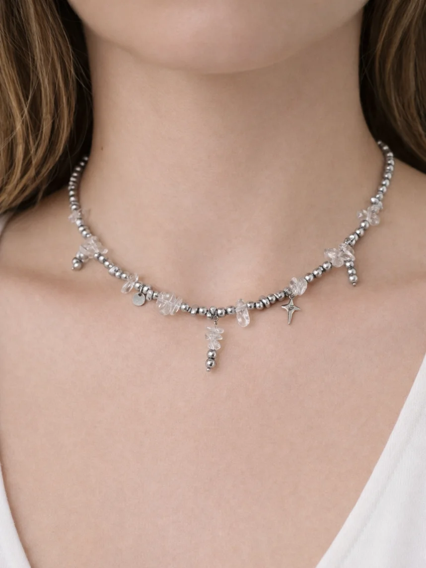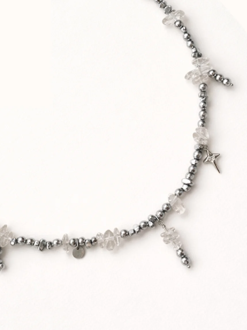 Чокер бренда Migette выполнен из гематита и латуни с родированным покрытием с камнями и подвесками.