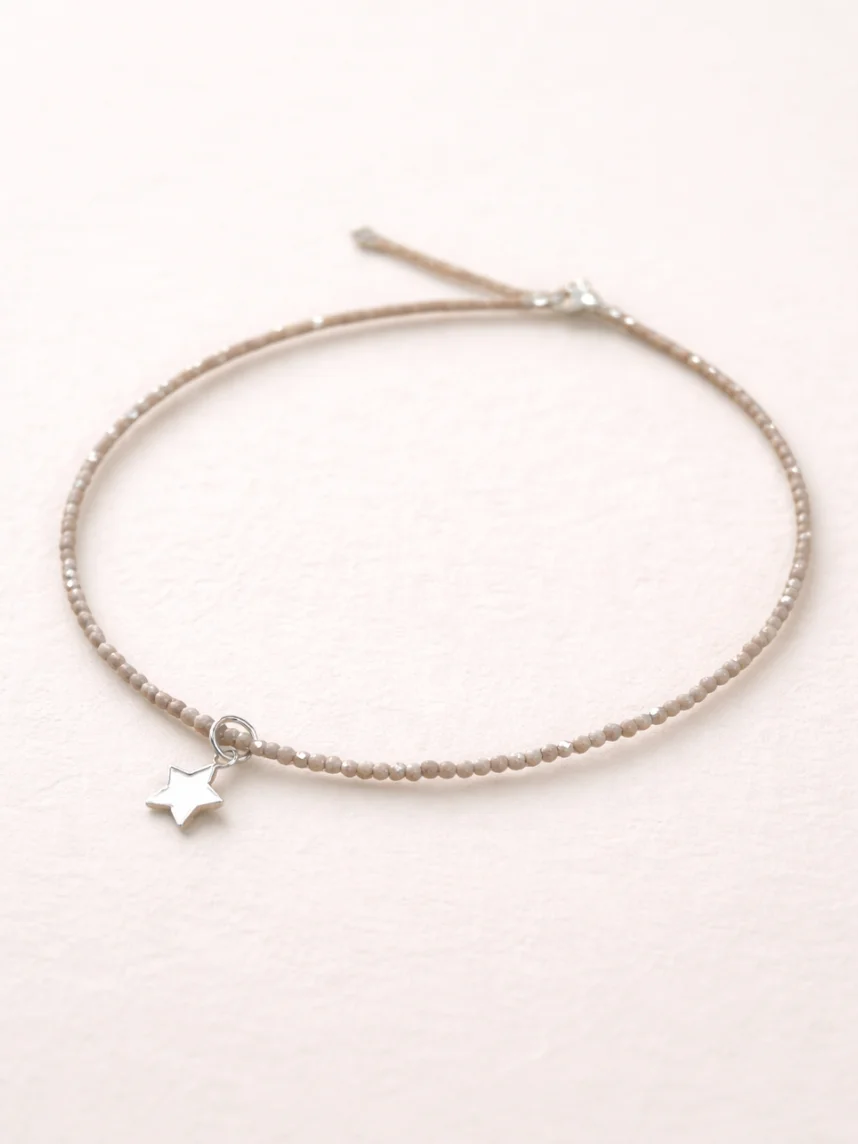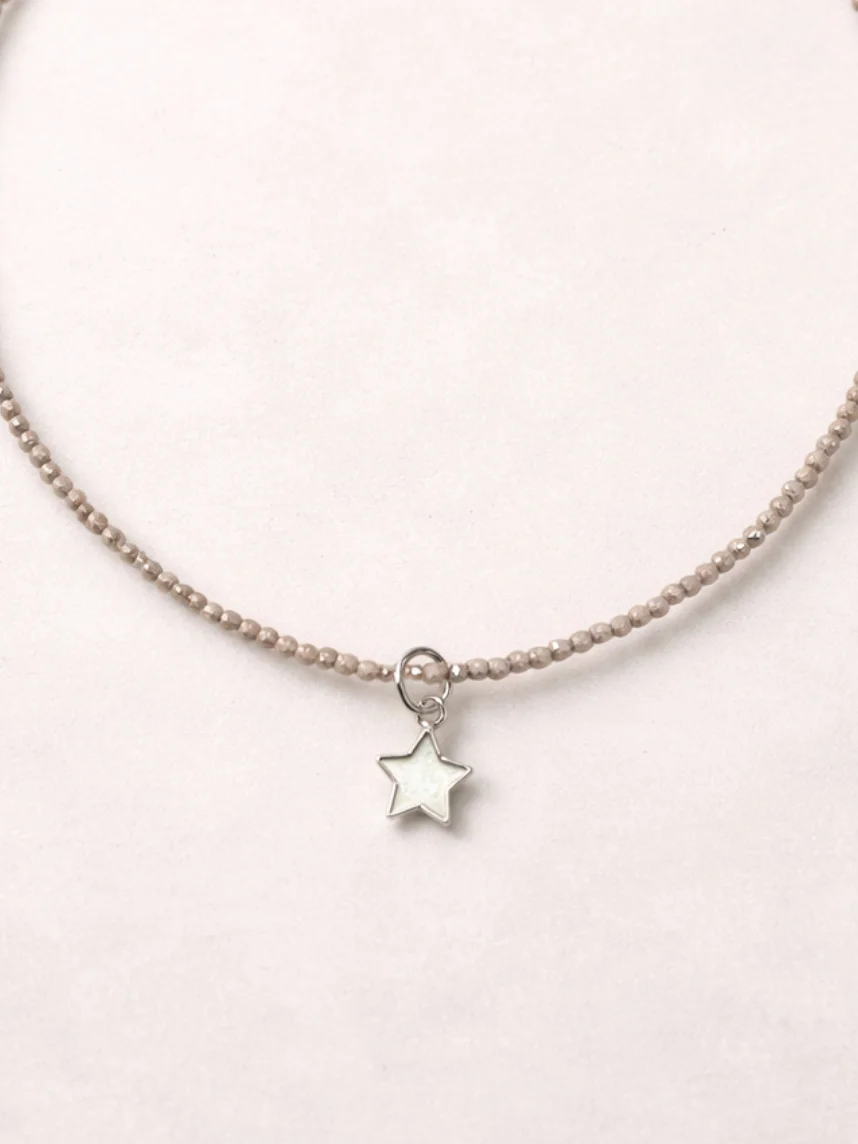 Этот чокер выполнен из мелких бежевых камней шпинели, создающих мягкий и элегантный блеск, а изящная подвеска в виде звёздочки придает ему особую миловидность.