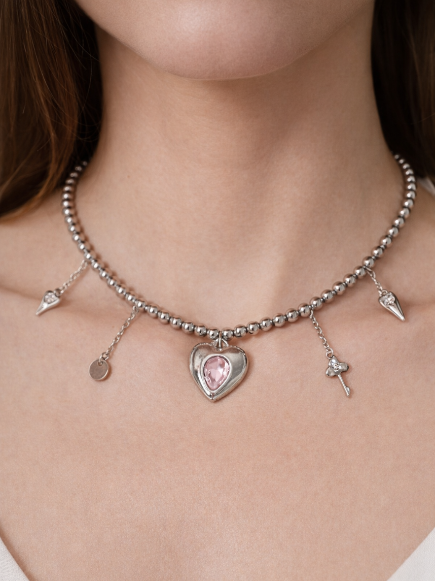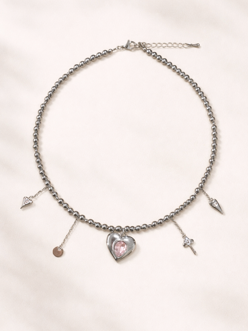 Чокер из тёмного гематита с подвесками «Сердечко с розовым камнем» Migette — очаровательное и стильное украшение, которое подчеркнет вашу нежность и индивидуальность.