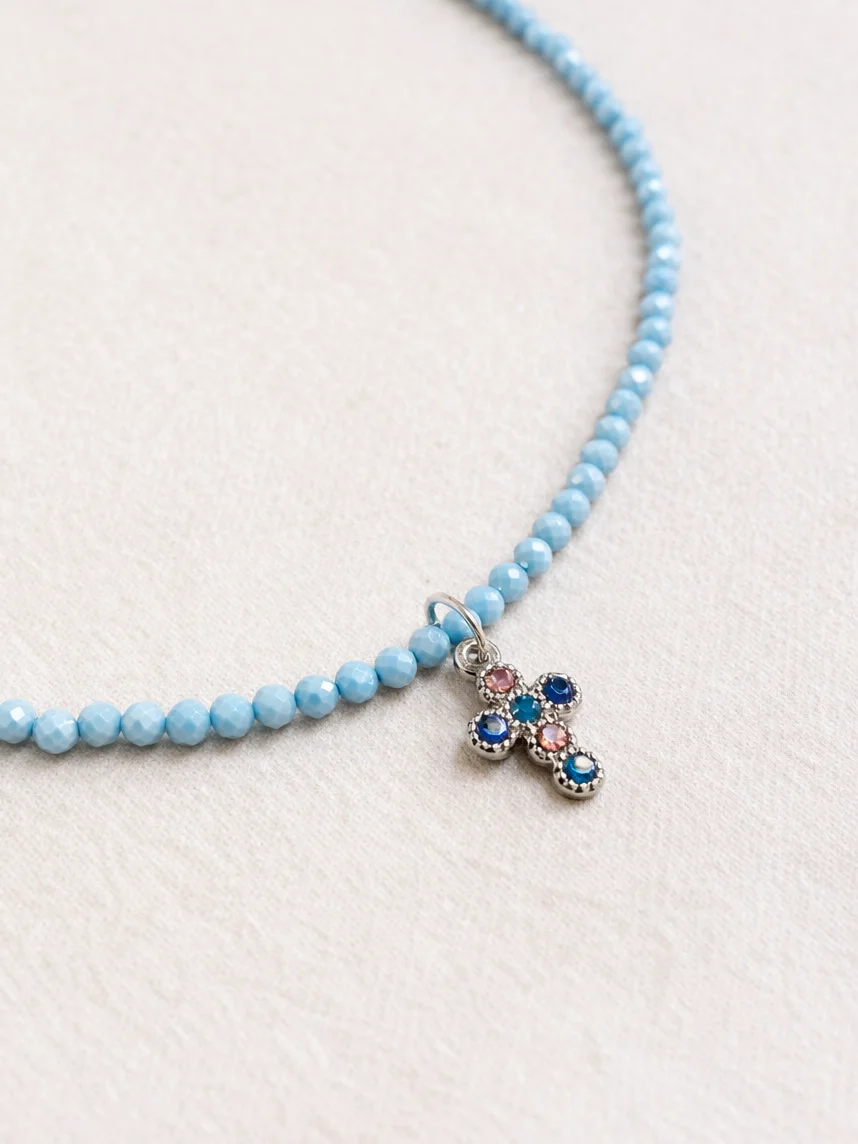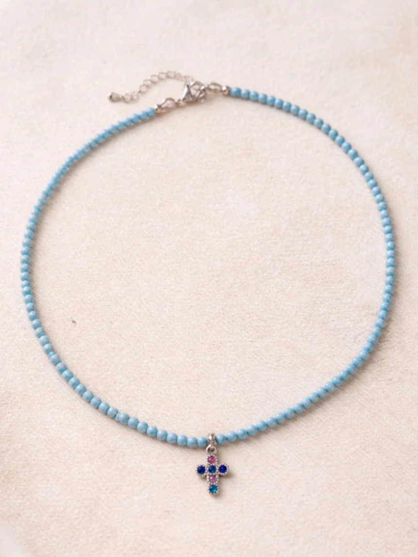 Чокер из голубого циркона с подвеской «Крестик» от Migette — изысканное украшение, которое добавит нежности и свежести вашему образу.
