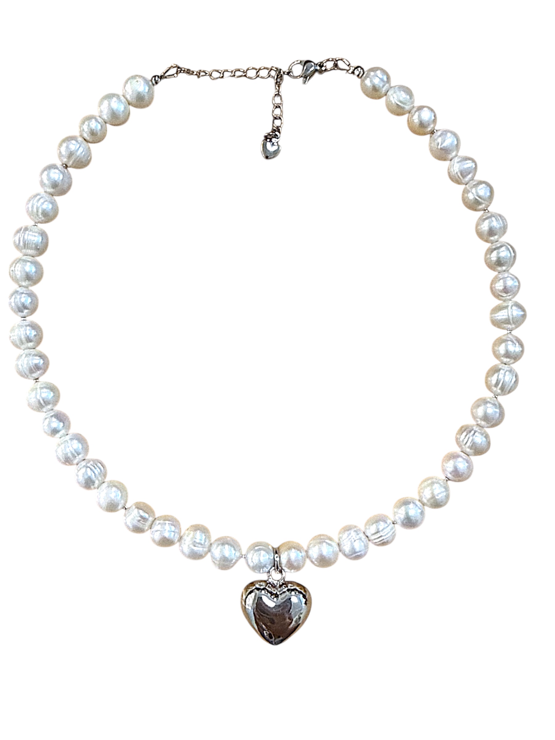 База из жемчужин делает чокер утонченным, а массивное металлическое сердце добавляет дерзкий акцент.